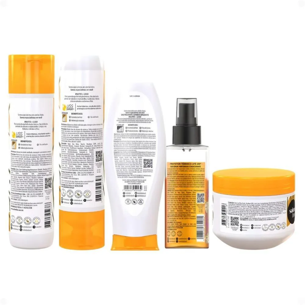 O Kit Contém: - 1 Shampoo Disciplinante Meu Liso Muito + Liso 300ml - 1 Condicionador Disciplinante Meu Liso Muito + Liso 300ml - 1 Máscara Capilar Disciplinante Meu Liso Muito + Liso 300g - 1 Óleo Bifásico Capilar Perfumado Meu Liso Muito + Liso 120ml - 1 Defrizante Capilar Meu Liso Muito + Liso 200ml