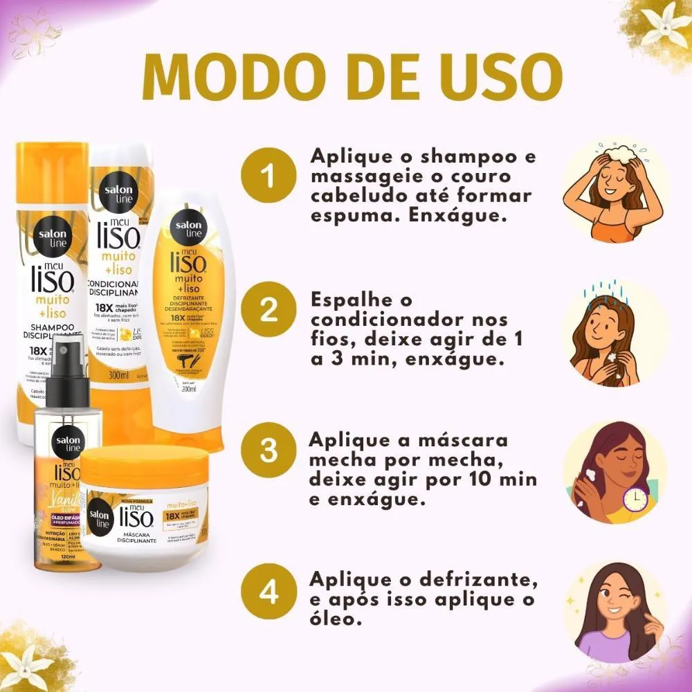 Shampoo: Aplique o Shampoo no cabelo molhado, massageie suavemente até formar espuma e enxágue bem. Repita se necessário. Condicionador: Após lavar o cabelo com o Shampoo, aplique o Condicionador do comprimento às pontas, massageie e enxágue completamente. Máscara Capilar: Com o cabelo limpo e úmido, aplique a Máscara mecha por mecha, enluvando os fios. Deixe agir de 10 a 20 minutos e enxágue abundantemente. Defrizante: Espalhe na palma das mãos uma quantidade do Defrizante Protetor Térmico Salon Line Muito + Liso de acordo com o comprimento do seu cabelo. Em seguida, com os fios úmidos ou secos, aplique o produto mecha a mecha. Inicie o processo de escovar com um secador e, se desejar, finalize com a prancha para conquistar um efeito superliso. Óleo Bifásico Capilar: Aplique algumas gotas do Óleo Bifásico no cabelo seco ou úmido, distribuindo do comprimento às pontas. Não enxágue.Anvisa Shampoo: 25351.561738/2018-27 Anvisa Condicionador: 25351.561930/2018-31 Anvisa Defrizante: 25351.235108/2022-86 Anvisa Máscara: 25351.219826/2022-13 Anvisa Óleo Bifásico: 25351.117674/2025-50