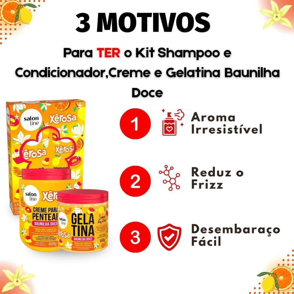 cabelo, garantindo fios saudáveis, com um toque irresistível e um perfume que encanta. Prepare-se para se apaixonar pela fragrância e pelos resultados que o Kit Salon Line Xêrosa Baunilha Doce oferece, elevando sua rotina de cuidados capilares a um novo patamar.
