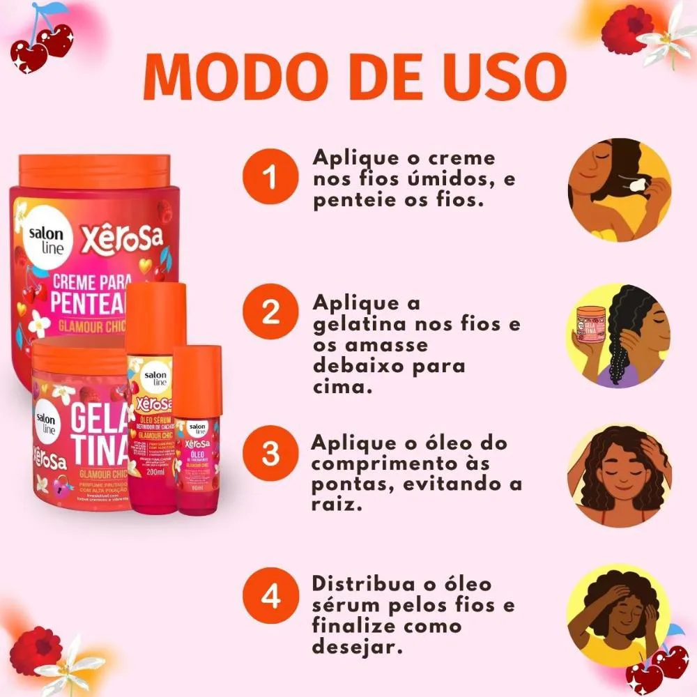 Kit Salon Line Xêrosa Glamour Chic: Creme para Pentear 800G, Gelatina Capilar, Óleo Sérum e Óleo Capilar 60Ml