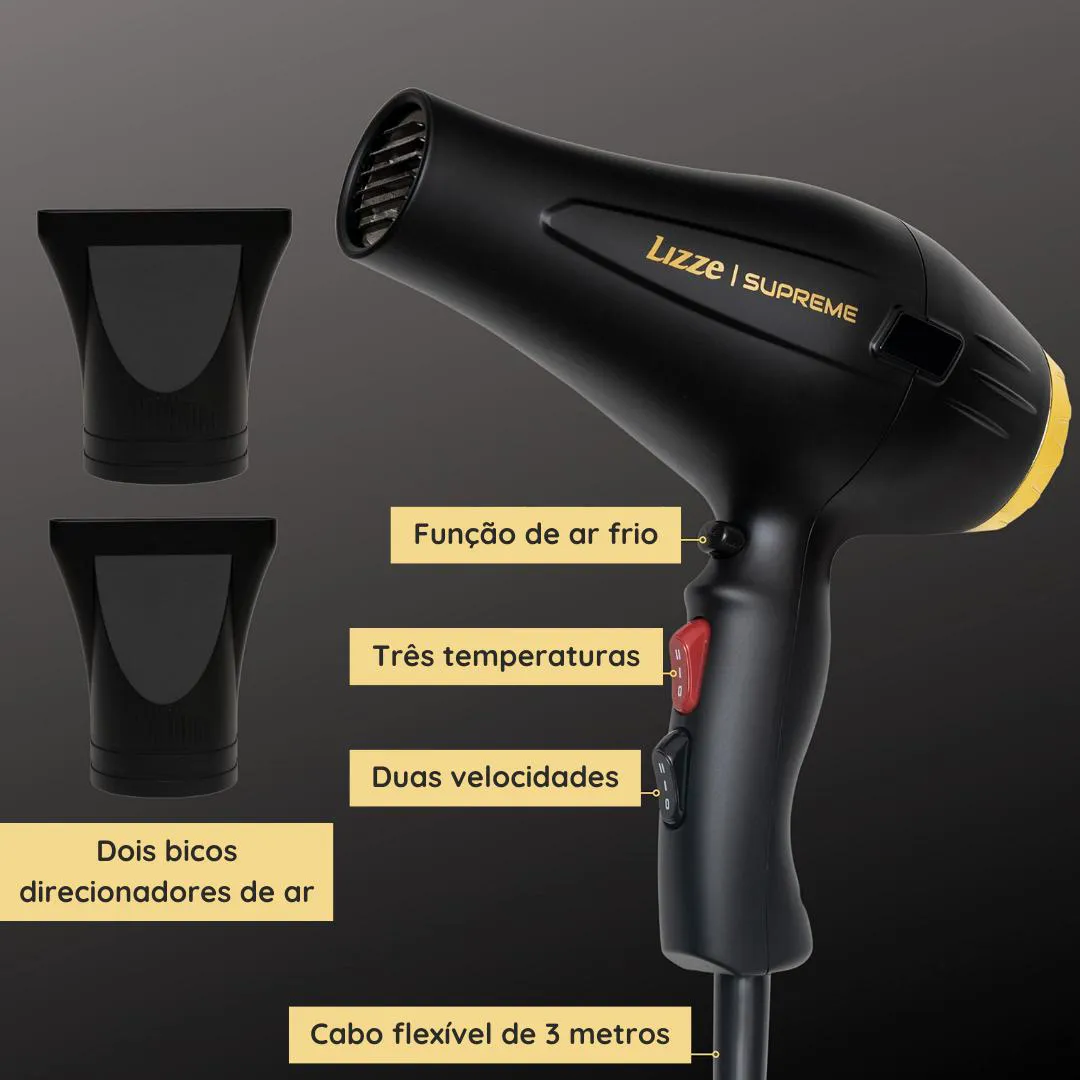 “O secador é potente e não pesa tanto na mão. Achei o leave-in que vem junto muito bom, deixou meu cabelo encorpado e com brilho.” Secador de Cabelo Lizze Supreme 2600W Profissional com Leave-In Lizze Supreme 2600W com motor AC, 3 temperaturas, 2 velocidades, ar frio, cabo 3m e leave-in. Potência profissional e cabelos impecáveis.