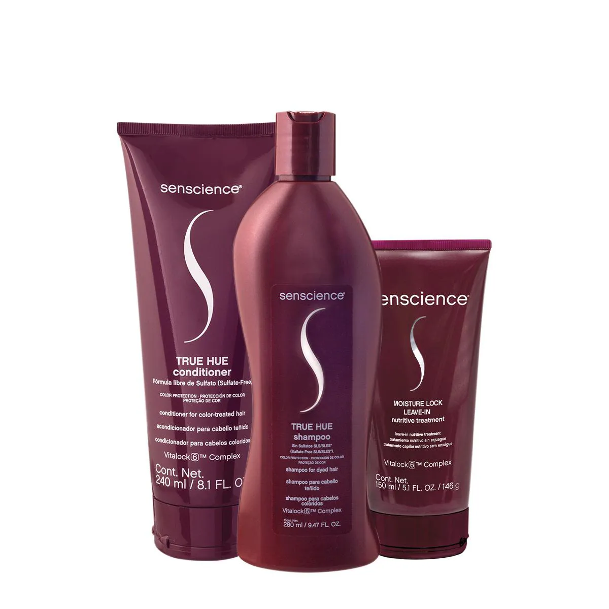 Este Kit Contém Senscience True Hue - shampoo 280ml: shampoo sem sulfato para cabelos naturais ou coloridos. Limpa o cabelo com sua fórmula suave, mas extremamente eficaz, sem agredir. Seu uso contínuo preserva até 98% da coloração. Também ajuda a condicionar os fios e protege dos raios solares, um dos principais causadores da oxidação e do desbotamento. Senscience True Hue - condicionador 240ml: condicionador sem sulfato para cabelos coloridos. Desembaraça e condiciona, hidratando intensamente. Melhora a flexibilidade e a elasticidade dos fios, evitando quebras. Ele protege dos raios solares, um dos causadores da oxidação e do desbotamento. Seu uso contínuo fortalece a fibra capilar e preserva até 98% da coloração. Senscience Moisture Lock - Leave-in 150ml: tratamento capilar sem enxágue e com proteção térmica, restaura e mantém o equilíbrio ideal e a hidratação dos cabelos, proporcionando maciez, brilho e melhora da flexibilidade.Conselho de Aplicação