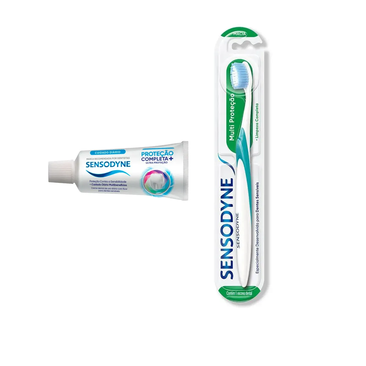 OKit Sensodyne escova de Dente Multi Proteção Macia + Creme Dental Proteção Completa + Ultra Proteção é um conjunto de produtos de higiene oral desenvolvidos para cuidar da saúde e sensibilidade dos dentes. A pasta de dente Sensodyne Proteção Completa+ Ultra Proteção é um creme dental de uso diário que promove proteção contra a sensibilidade e cuidado diário multibenefícios, com fórmula clinicamente comprovada que protege contra sensibilidade, garante branqueamento avançado e remove placas e tártaro. Já a escova dental Sensodyne Multiproteção possui cerdas macias e finas que limpam de maneira eficaz e suave, evitando irritações, sangramentos e dores na gengiva.