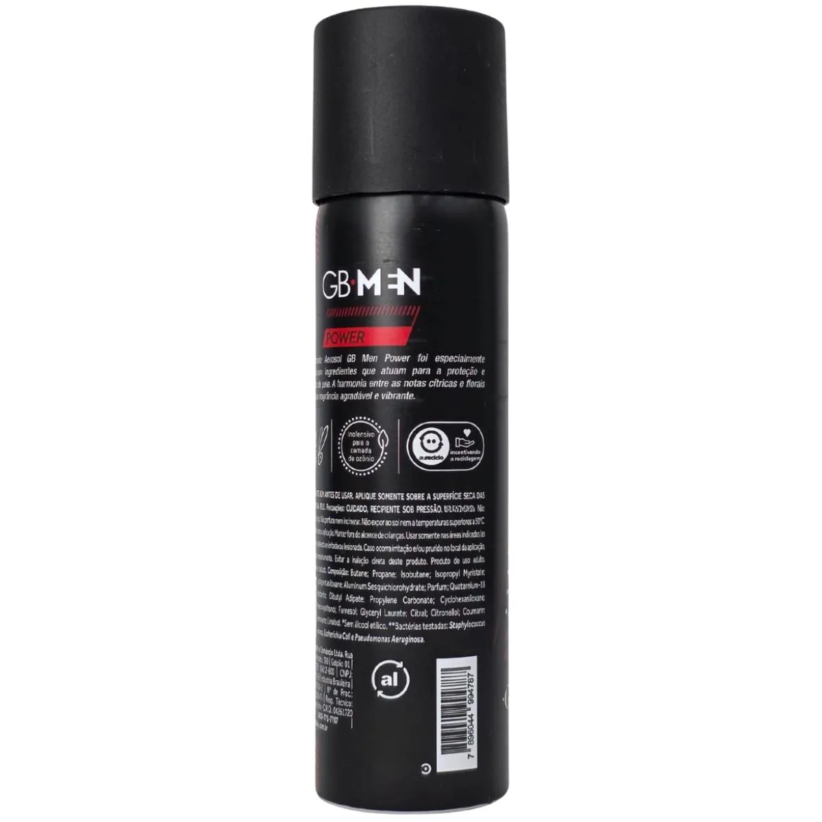 Finalidade: O Desodorante Aerossol GB Men Power foi especialmente formulado com ingredientes que atuam para proteção e perfumação da pele. A harmonia entre as notas cítricas e florais compõe uma fragrância agradável e vibrante.