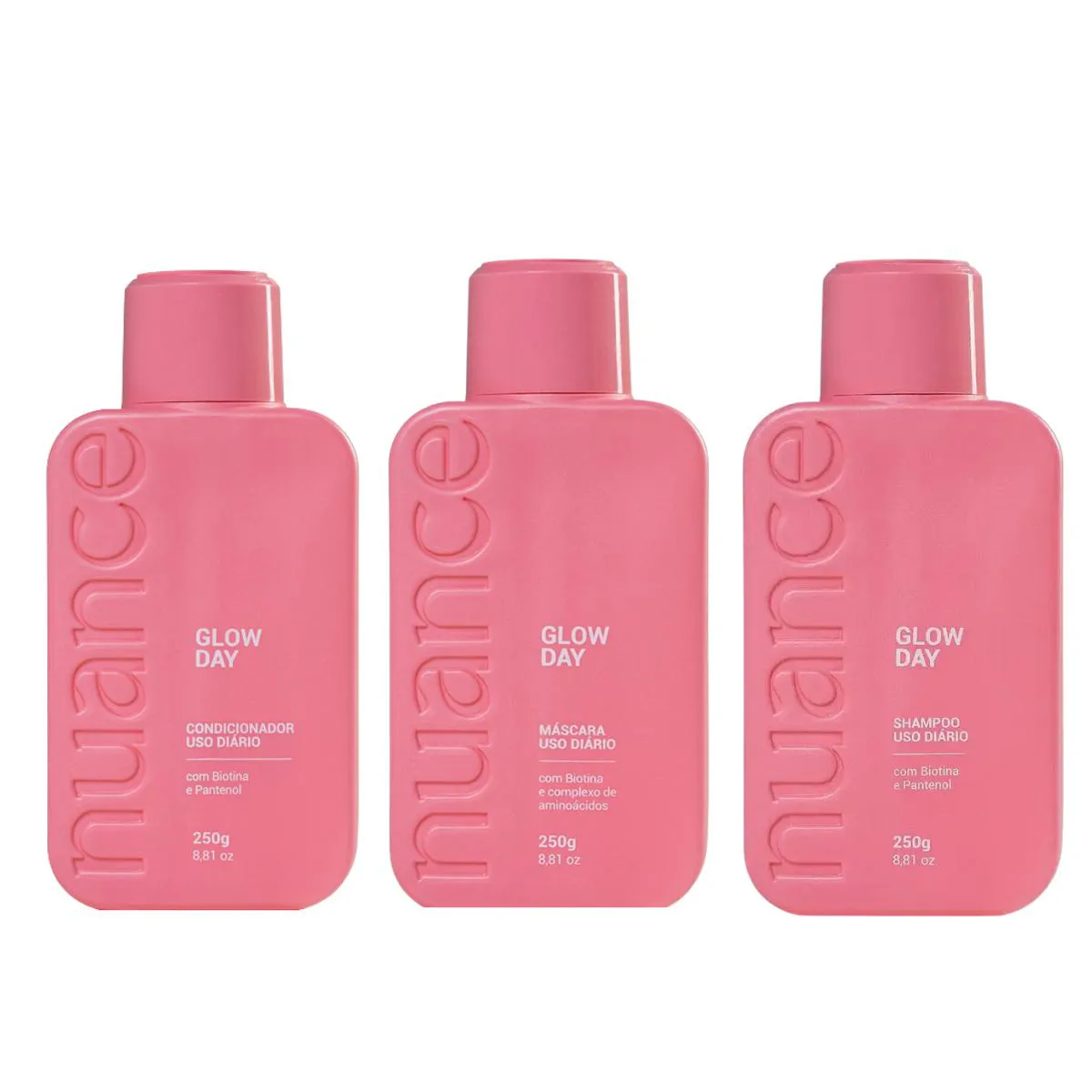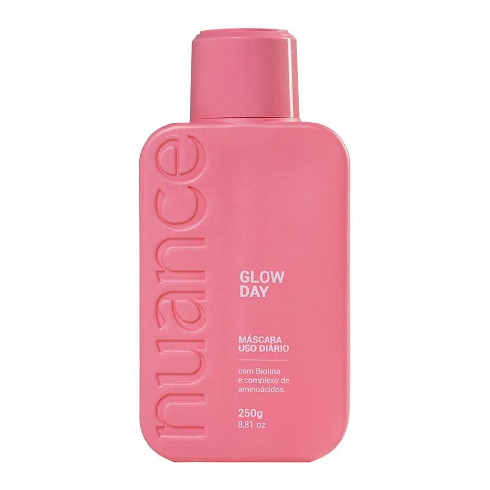shampoo 250ml + condicionador 250ml + Máscara de Hidratação 250ml O cuidado diário completo que seus cabelos merecem! O Kit Glow Day da Nuance foi desenvolvido para proporcionar hidratação equilibrada, brilho natural e maciez desde a primeira aplicação. Ideal para todos os tipos de cabelo, ele combina limpeza suave, condicionamento eficaz e tratamento intensivo em uma rotina prática e eficaz. O Shampoo limpa sem agredir, o Condicionador desembaraça e hidrata com leveza, e a Máscara nutre profundamente, recuperando a saúde dos fios com uso diário. Benefícios: