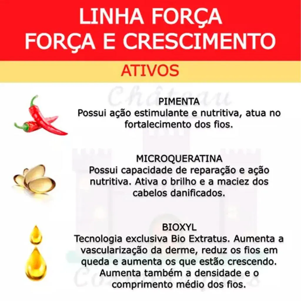 Contém: Bio Extratus Força com Pimenta - Shampoo 350ML: promove uma limpeza equilibrada, devolvendo brilho e vitalidade. Bio Extratus Força com Pimenta - Condicionador 350ML: condiciona imediatamente os fios, fortalece e dá brilho. Conselho de Aplicação