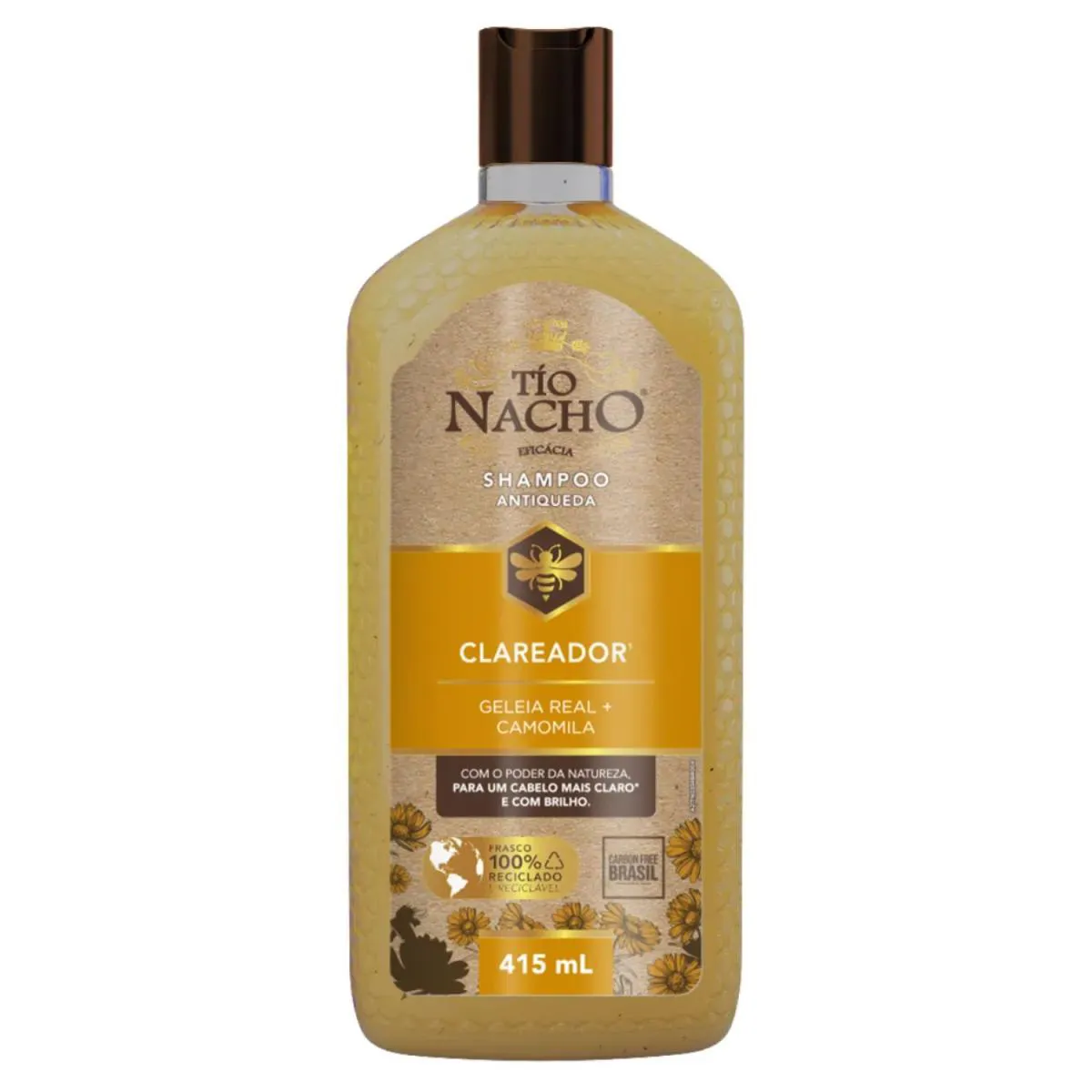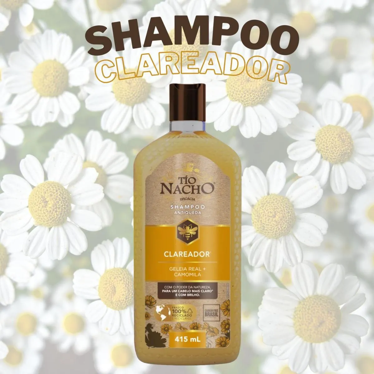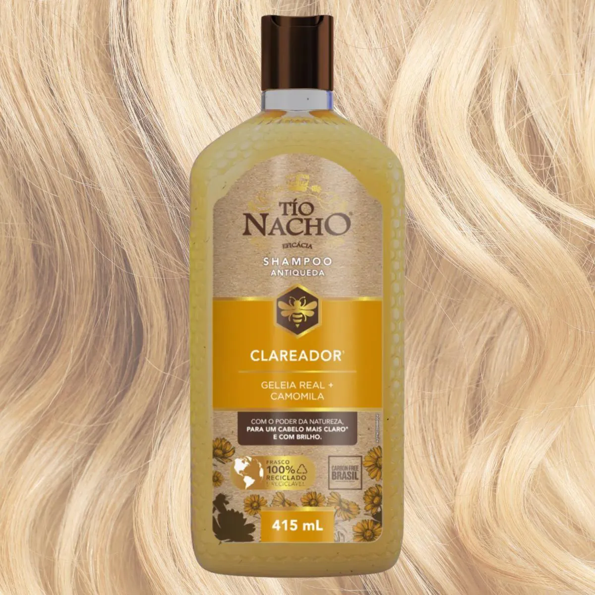 O Shampoo Tio Nacho Clareador realça gradualmente a luminosidade dos fios, proporcionando um efeito iluminado e natural. Sua fórmula com camomila, geleia real e extratos naturais limpa delicadamente, nutre e fortalece, deixando o cabelo macio, saudável e com brilho radiante. Ideal para realçar tons claros e dar mais vida aos cabelos.