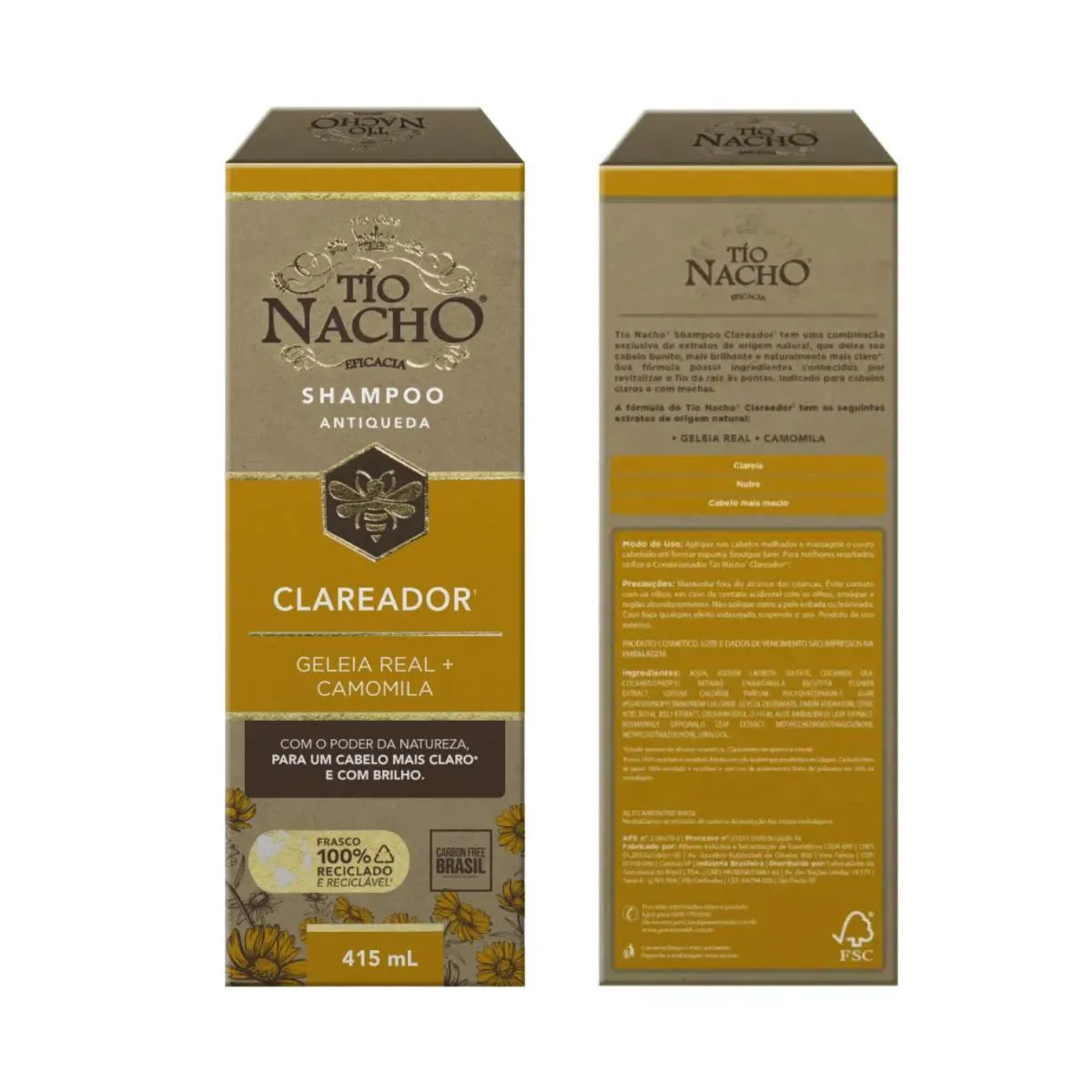 Kit shampoo e condicionador Tio Nacho Clareador 415mlNeste Produyo está sendo enviado 1(uma) unidade do Shampoo Tio Nacho Clareador 415ml e 1(uma) unidade do Condicionador Tio Nacho Clareador 415mlShampoo Tio Nacho Clareador 415ml