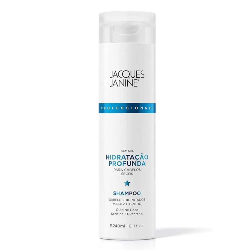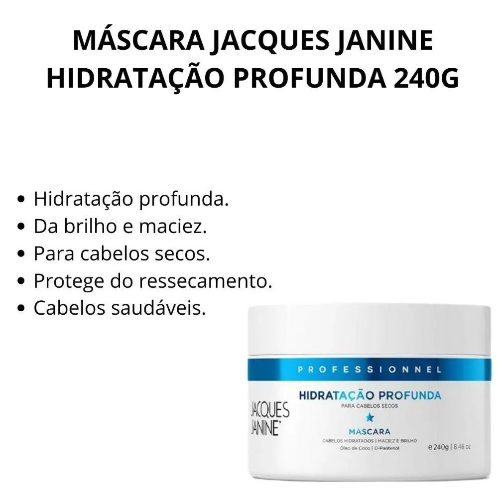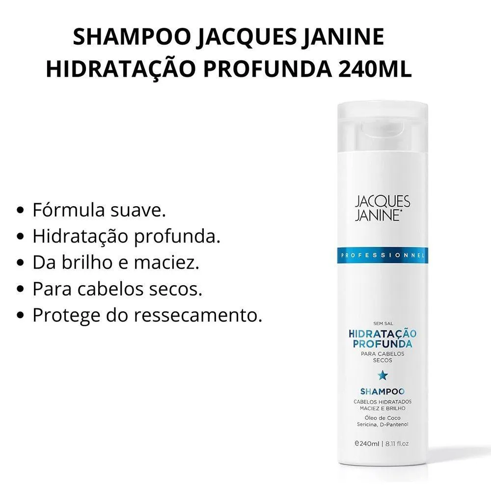 O shampoo Hidratação Profunda Jacques Janine possui uma fórmula suave e hidratante, desenvolvida principalmente para os cabelos secos, ele forma uma espuma cremosa que promove uma perfeita higienização dos cabelos formando um filme hidratante. Modo de Uso: Aplique no cabelo molhado e massageie suavemente o couro cabeludo com a ponta dos dedos até obter espuma. Enxágue. Repita se necessário para um melhor resultado. A Máscara Original da marca Jacques Janine Professionnel possui ação de hidratação intensiva e preserva a integridade dos fios mais fragilizados por excesso de porosidade. Restaura brilho e maciez tornando-os mais flexíveis e luminosos. Modo de Uso: Aplique a máscara sobre o cabelo limpo e úmido; Mecha a mecha, das pontas à raiz; Deixe agir de 10 a 20 minutos; Enxague. Precauções: Uso externo. mantenha fora do alcance das crianças. Em caso de alergia a qualquer um dos componentes da fórmula, suspenda o uso.. Especificações: Tipos de Cabelos: Normal ou todos os tipos Necessidade: Hidratação e Maciez Público: Todos Tamanho: Shampoo 240ml e Máscara 240ml Linha: Hidratação Profunda