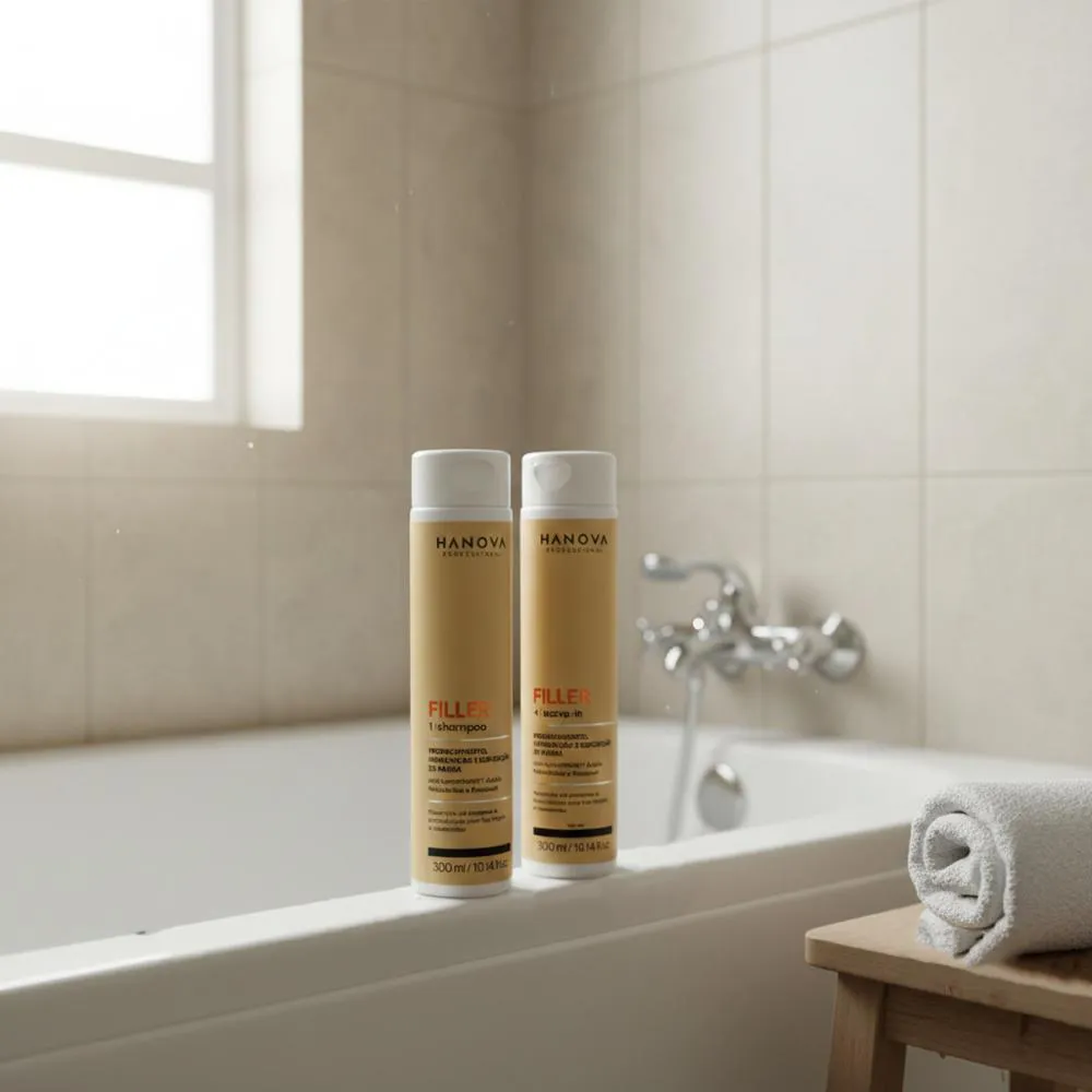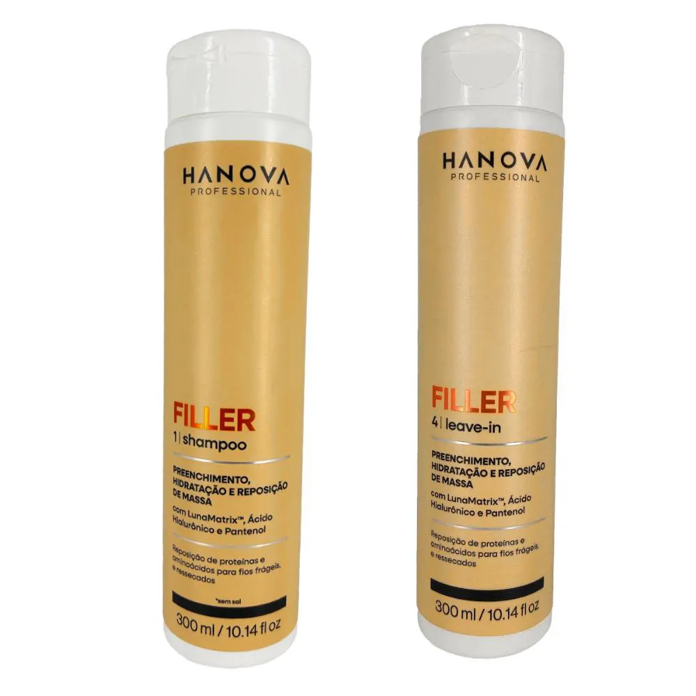 Hanova - Kit shampoo + Leave-in Filler 300ml Proporciona volume e densidade para cabelos finos e fragilizados. Desenvolvido com Luna Matrix, ácido hialurônico e D-Pantenol, ele preenche a fibra capilar, devolvendo corpo, resistência e vitalidade sem perder a leveza. - Fios encorpados; - Repara danos profundos;- Cabelos fortes e resistêntes. Sujestão de uso:1 - Aplique o Shampoo Filler nos fios molhados, massageando bem o couro cabeludo;2 - Enxágue retirando totalmente o produto;3 - Após condicionar, nos cabelos úmidos ou já secos, aplique uma quantidade considerável do Leave-in Filler e espalhe bem;4 - Não enxágue. O que você está comprando!01 - Shampoo Filler Hanova - 300ml;01 - Leave-in Filler Hanova - 300ml. ANVISA Shampoo: 25351.153513/2025-20;Leave-in: 25351.153287/2025-87. *Não testado em animais;*Imagens meramente ilustrativas.