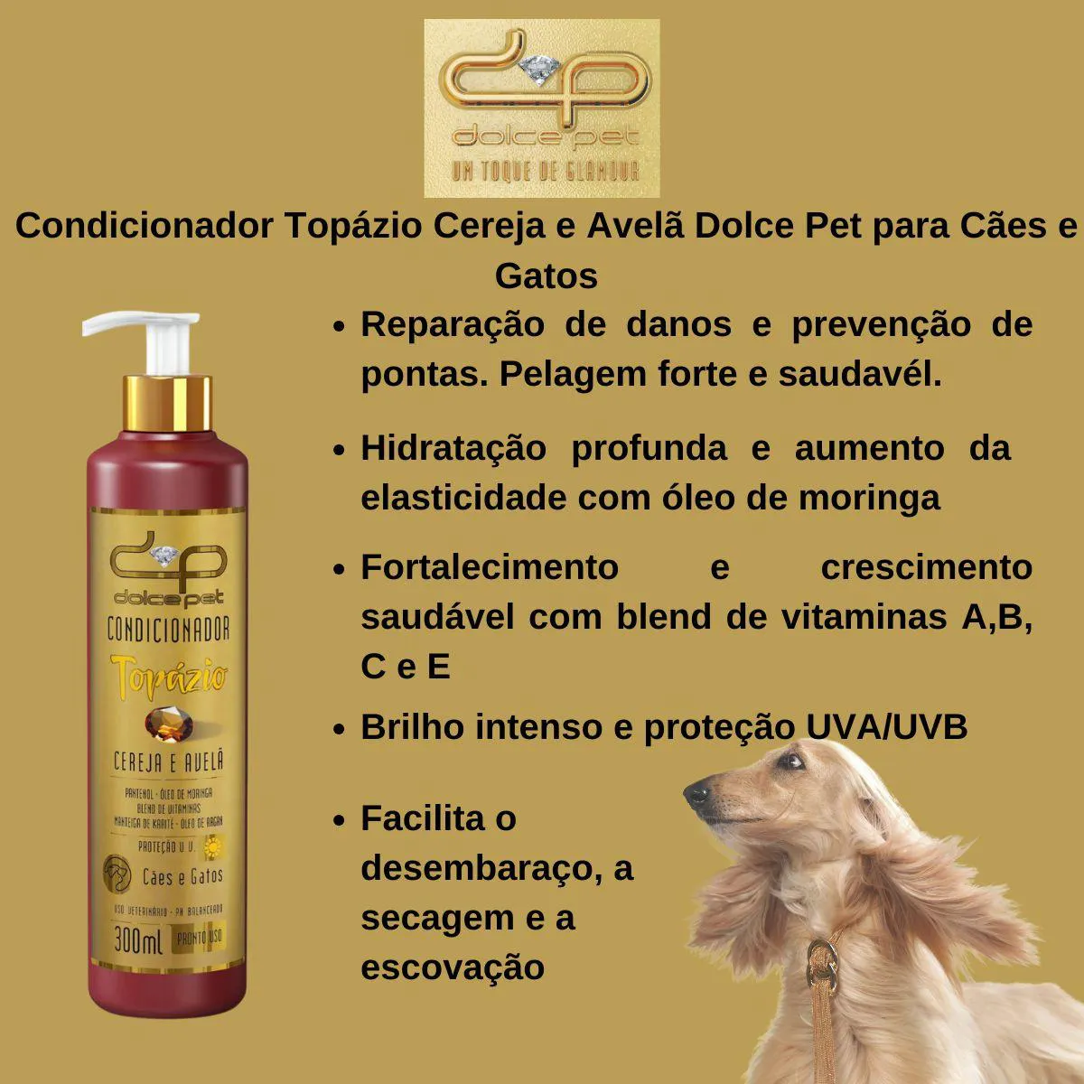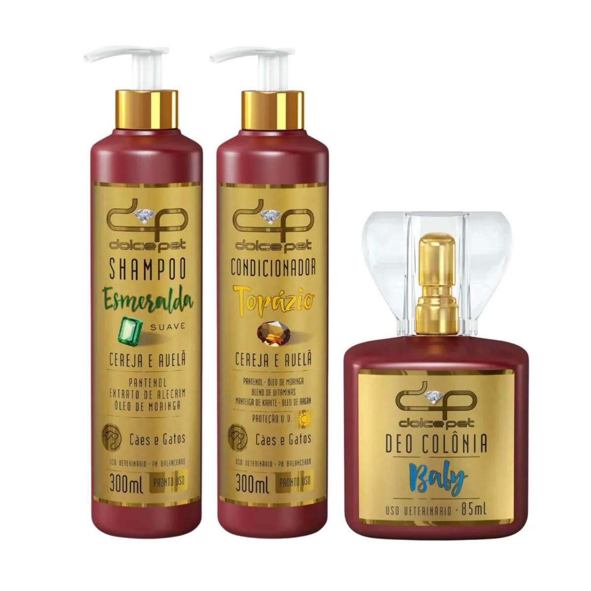 Kit Dolce Pet shampoo Suave + condicionador Topázio + DEO colônia Baby – Cães e Gatos Proporcione ao seu pet o cuidado completo com o Kit Dolce Pet! Este conjunto premium inclui o Shampoo Suave, o Condicionador Topázio e a DEO Colônia Baby, garantindo uma pelagem limpa, macia e perfumada, sem irritar os olhos ou a pele, hidratação profunda. Shampoo Suave Dolce Pet O Shampoo Suave Dolce Pet foi cuidadosamente desenvolvido para oferecer uma higienização delicada e eficaz dos pelos do seu pet, sem irritar os olhos ou a pele. Sua fórmula suave conta com ativos especiais que promovem uma limpeza profunda, mantendo os pelos saudáveis e brilhantes. O pantenol repara os danos, retém a umidade, evita pontas duplas e confere brilho e maciez, restaurando a vitalidade dos fios. O óleo de moringa, rico em antioxidantes e contendo ômega 6 e ômega 9, oferece uma hidratação diferenciada e melhora a elasticidade dos pelos. Condicionador Topázio Dolce Pet