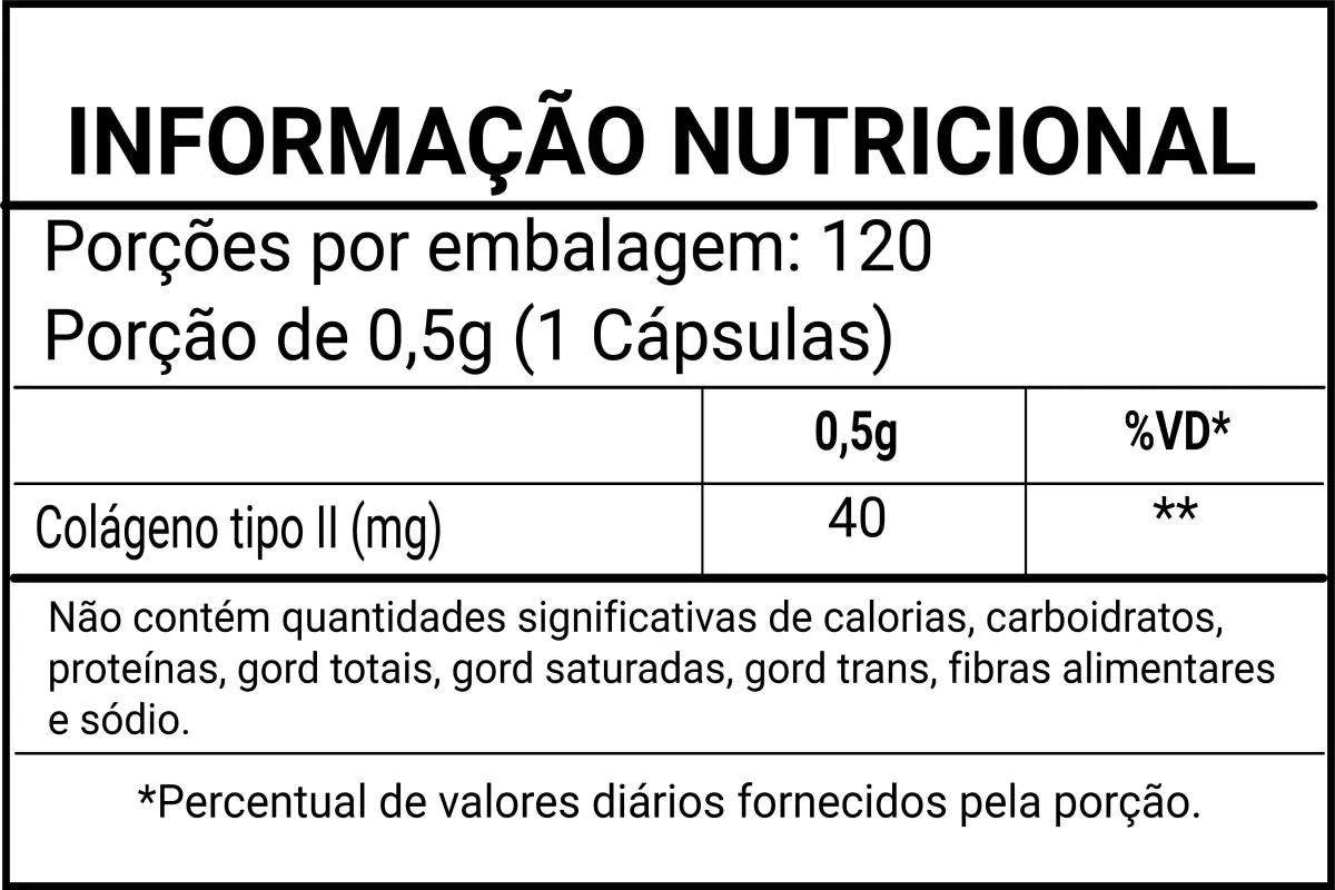 saúde das articulações e melhorar a mobilidade. Este produto contém colágeno tipo II, um componente essencial da cartilagem, combinado com silicato de magnésio, que auxilia na absorção e eficácia do colágeno. A embalagem contém 120 cápsulas, oferecendo um custo-benefício superior em comparação com as embalagens comuns de 60 cápsulas disponíveis no mercado. Esta formulação facilita o consumo diário e garante uma suplementação prática e eficaz.