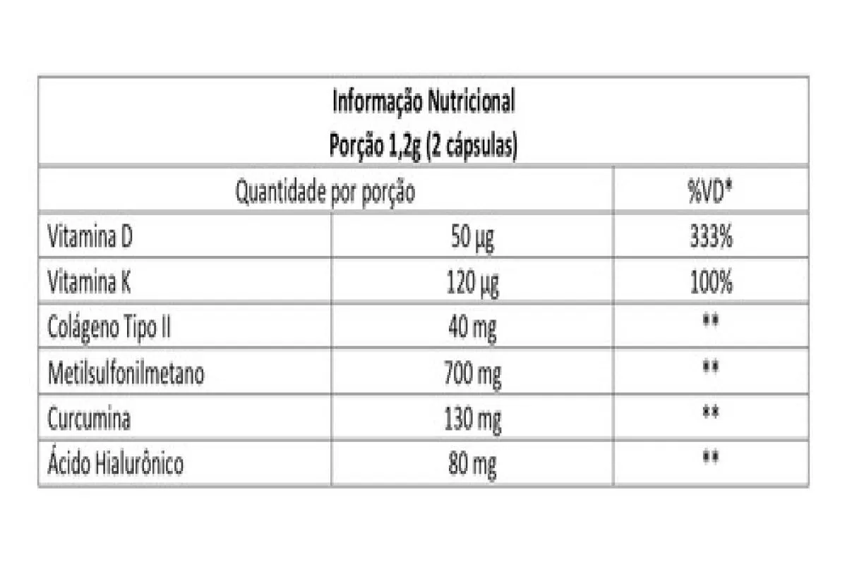 - Fórmula com colágeno, MSM e ácido hialurônico.