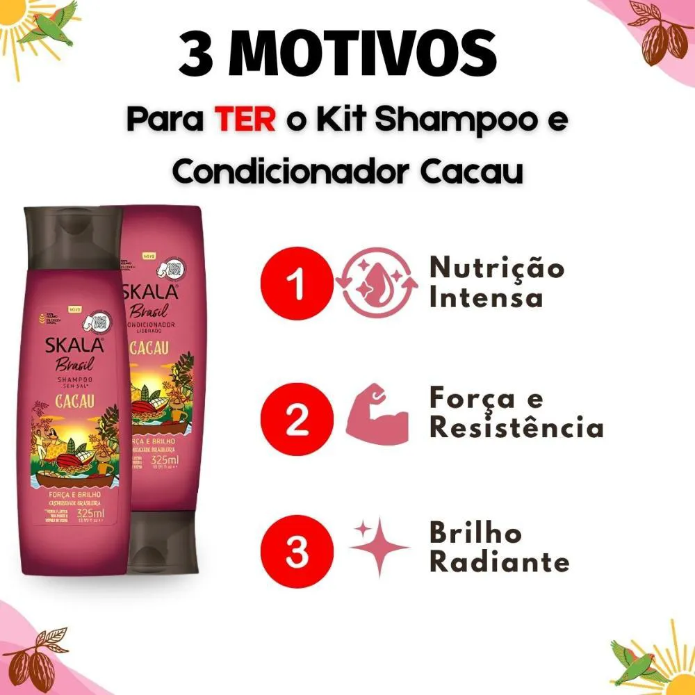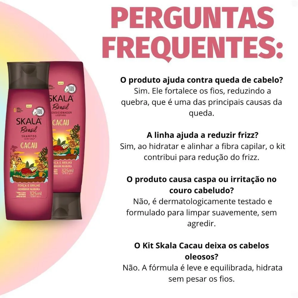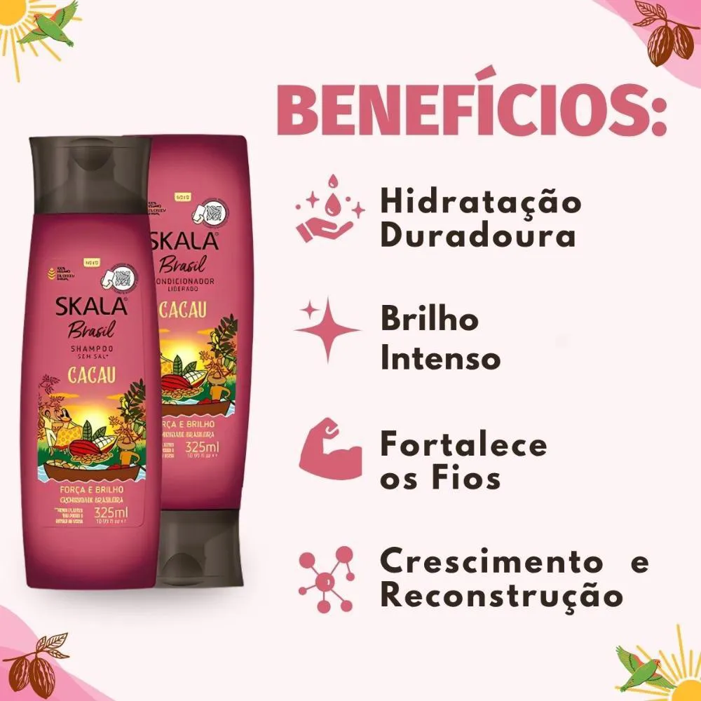 SHAMPOO: Aplique nos cabelos úmidos e massageie suavemente até obter uma espuma cremosa. Enxágue bem e repita a operação caso julgue necessário. Para melhores resultados, utilize a linha completa Skala Brasil Cacau.CONDICIONADOR: Após higienizar os fios com o Shampoo, aplique o Condicionador uniformemente sobre o cabelo limpo e úmido. Deixe agir de 1 a 3 minutos e, em seguida, enxágue. Utilize como finalizador sem enxágue para maior proteção e brilho.Anvisa: 25351.453162/2023-92 (shampoo)Anvisa: 25351.453262/2023-19 (condicionador)