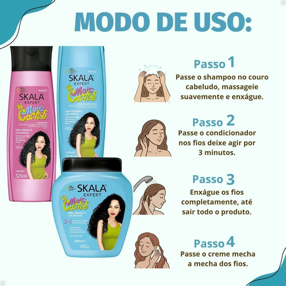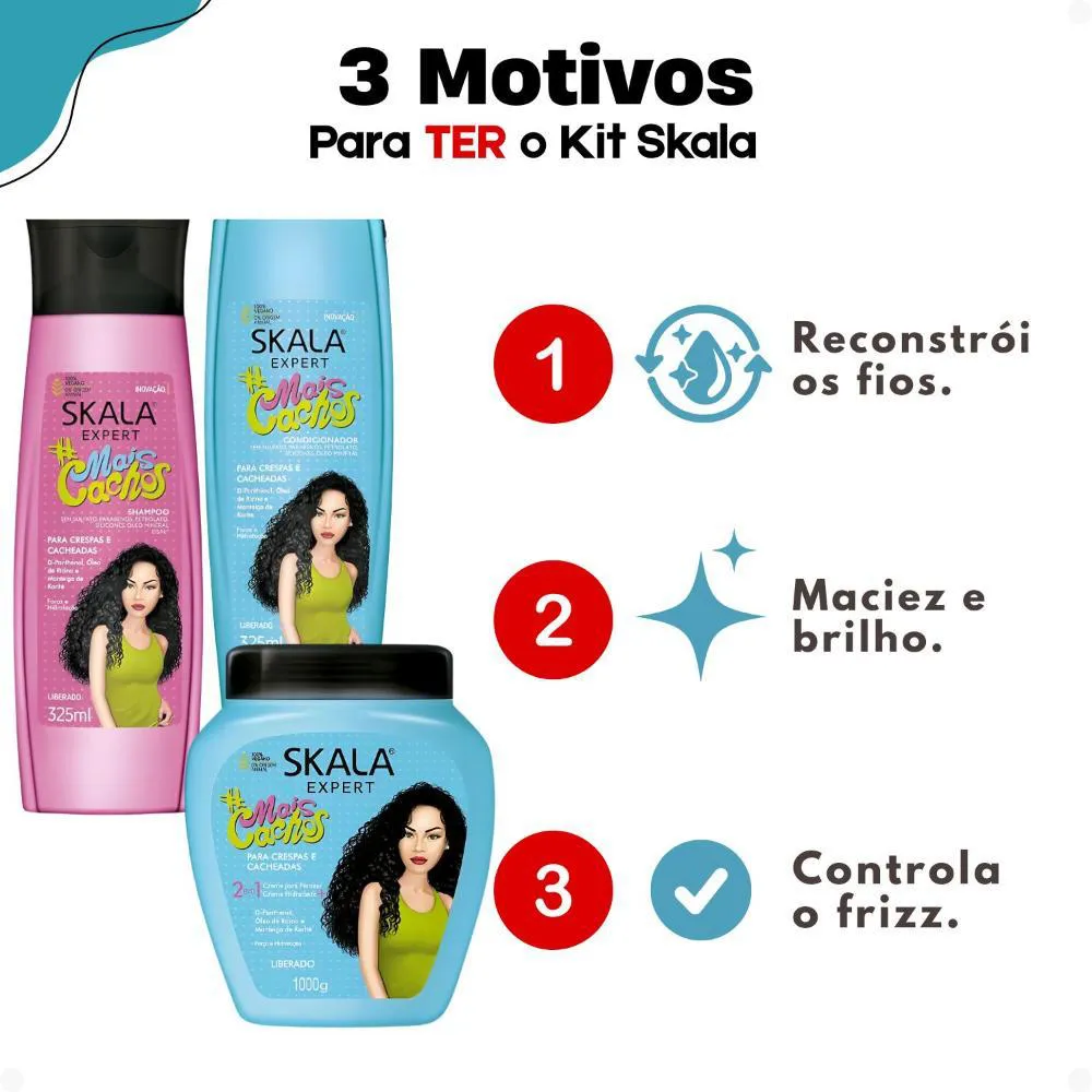 cacheados, crespos, crespíssimos ou em transição. Este kit essencial da SKALA oferece um tratamento que atende às necessidades específicas dos seus fios, proporcionando hidratação profunda, desembaraço facilitado e um brilho espetacular. Composto por Shampoo e Condicionador 325ml e um potente Creme de Tratamento 1000g, ele garante força, ultra reparação e o volume que você sempre desejou.Transforme seus cabelos com um cuidado que combate os principais sinais de danos, como ressecamento,