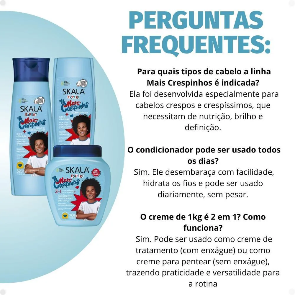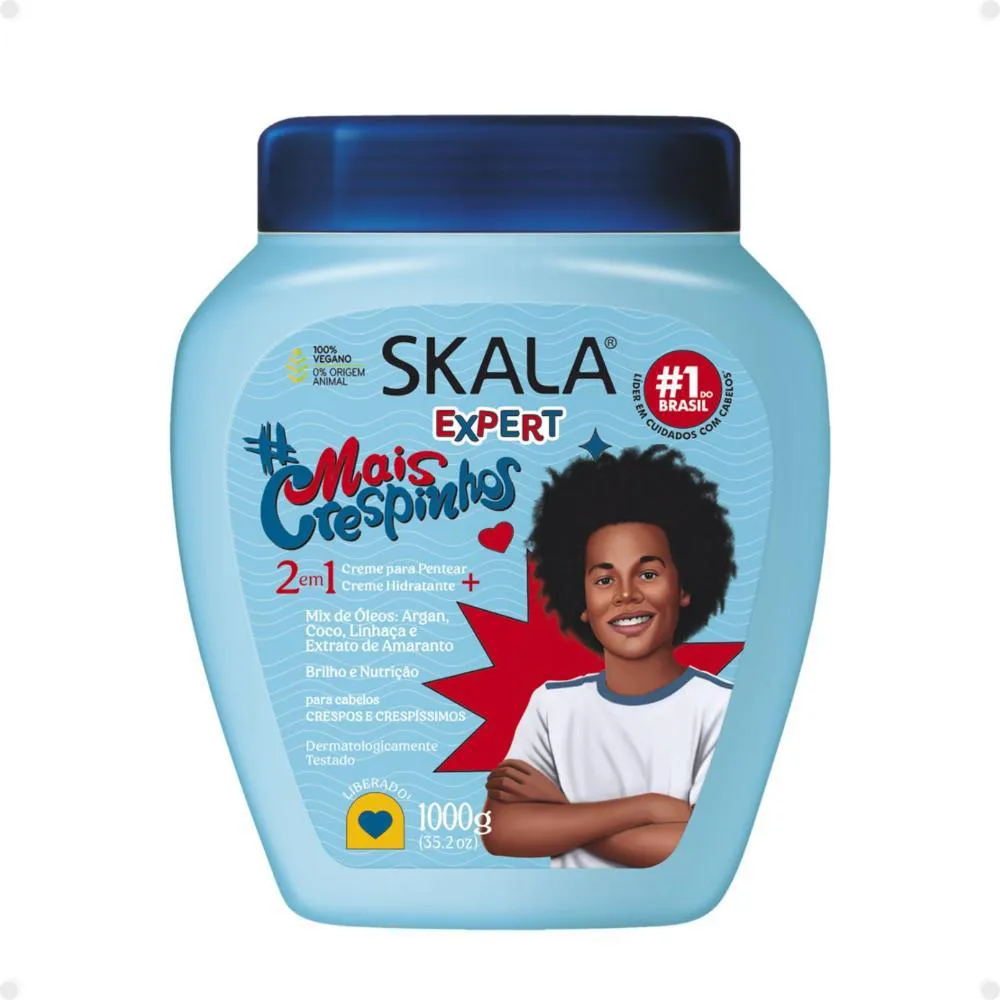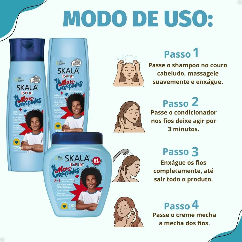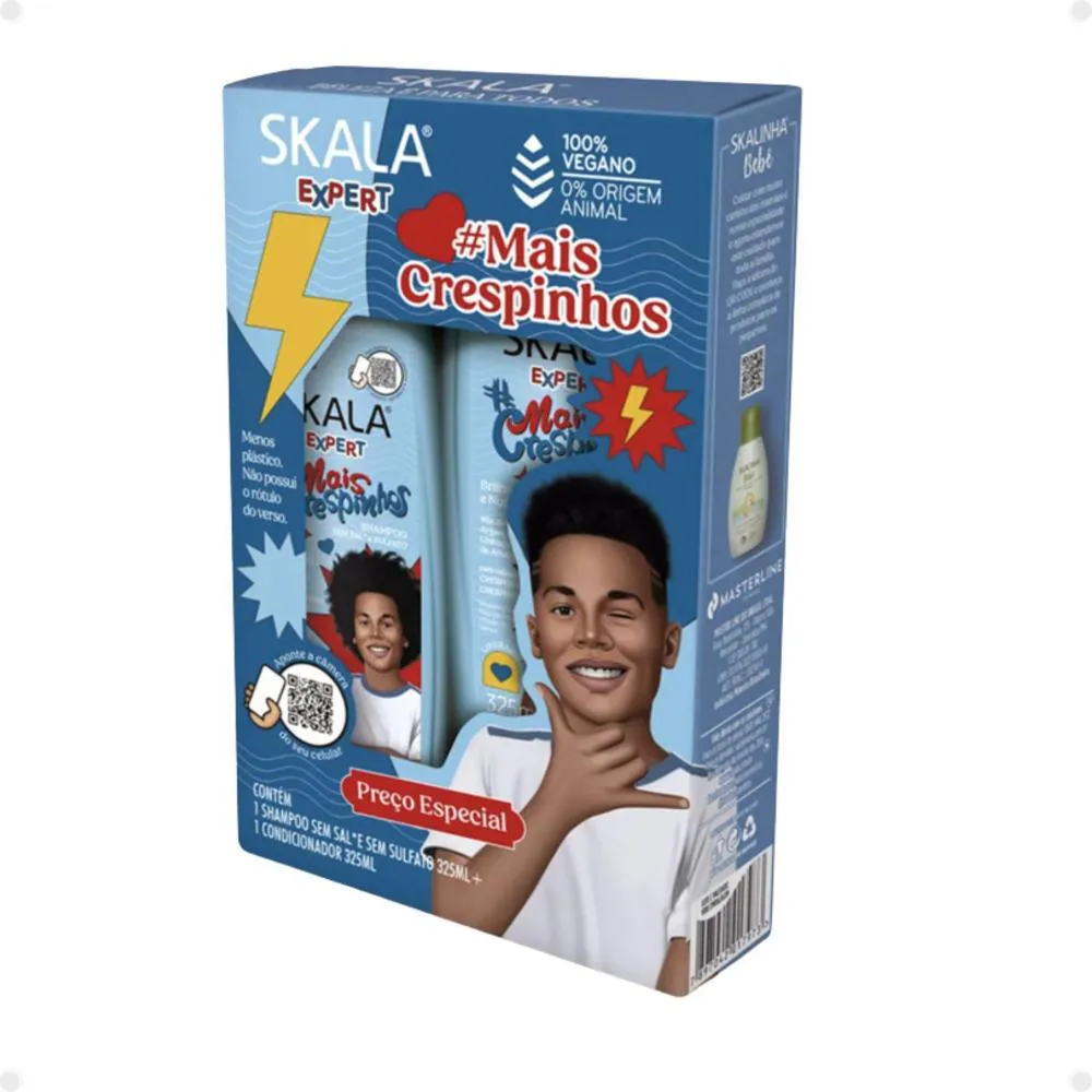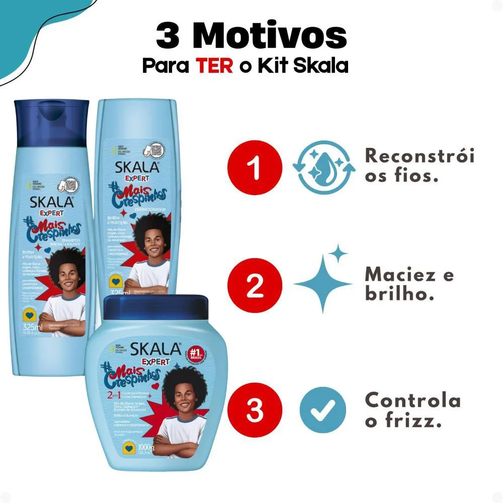 cacheados e crespos dos pequenos com o Kit Skala Expert Mais Crespinhos. Este kit completo, da renomada marca SKALA, oferece uma formulação delicada que limpa sem ressecar, proporcionando nutrição intensa, brilho radiante e um eficaz efeito antifrizz. Seus fios ficarão macios, saudáveis e fáceis de pentear, com uma linha totalmente liberada, livre de sulfatos, parabenos, petrolato e óleo mineral, perfeita para crianças a partir dos 3 anos de idade. A linha Skala Expert Mais Crespinhos foi desenvolvida para facilitar a rotina de cuidados com cabelos crespos e crespíssimos, combinando ativos que nutrem, dão vida aos fios opacos e modelam suavemente.