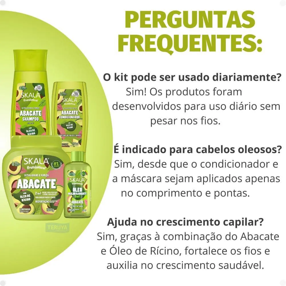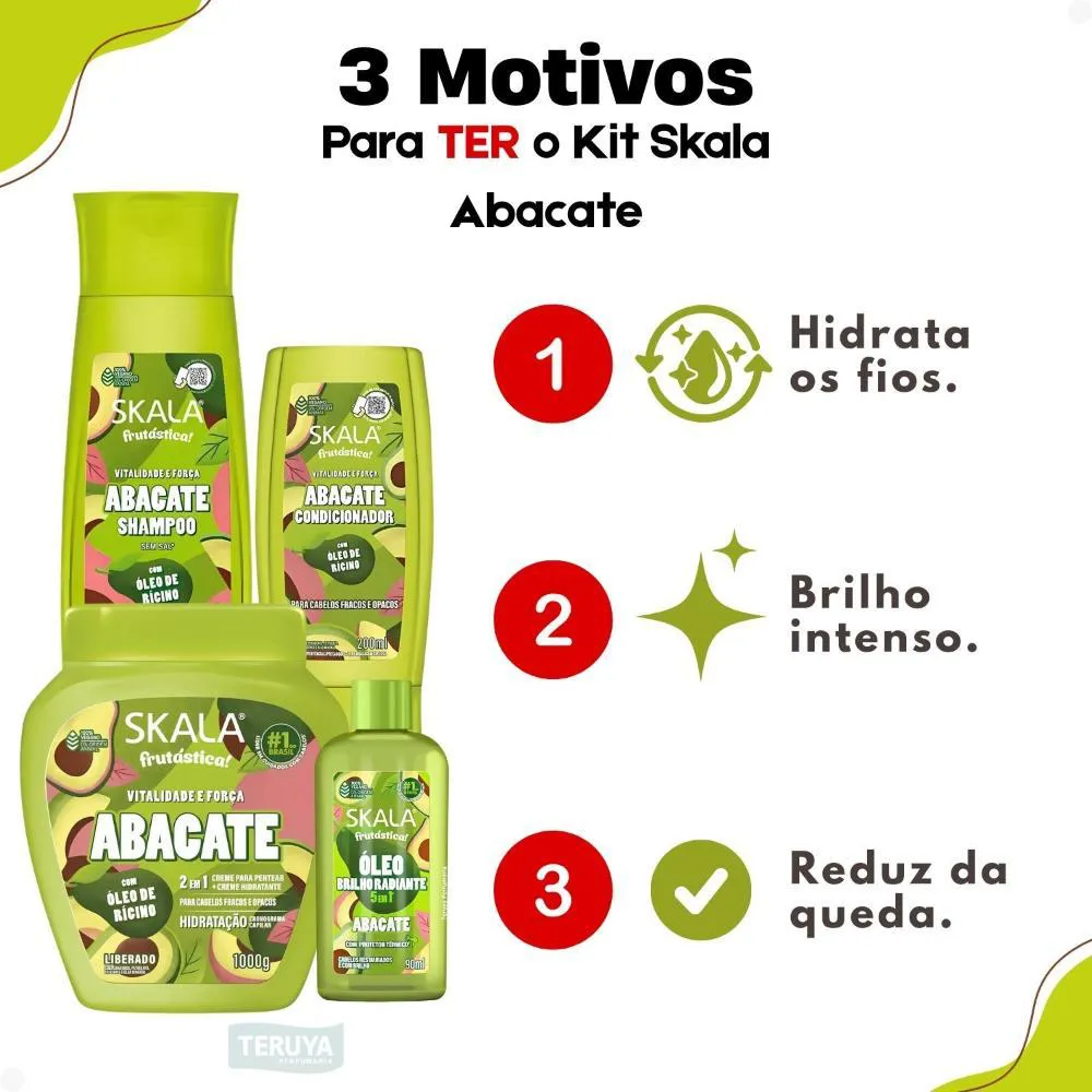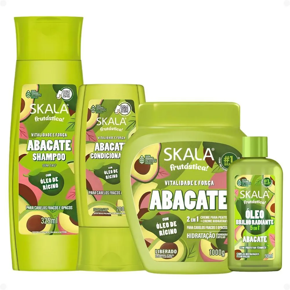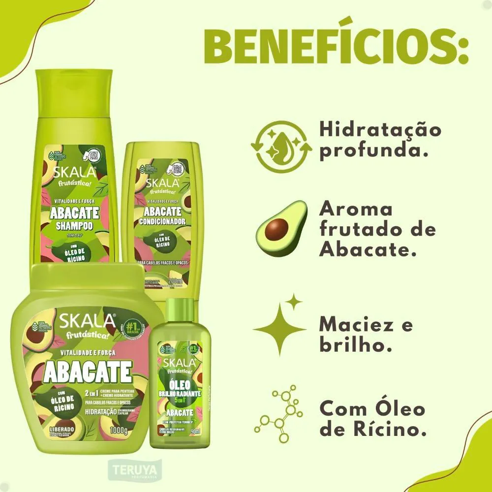 Descubra o poder transformador da natureza com o Kit Skala Frutástica Abacate, a solução definitiva para cabelos que necessitam de hidratação intensa, fortalecimento e vitalidade. Este kit completo, composto por Shampoo, Condicionador, Creme de Tratamento de 1000g e Óleo Capilar de 90ml, foi cuidadosamente formulado para proporcionar um cuidado profundo e restaurador. A poderosa combinação de Extrato de Abacate, Óleo de Rícino e Extrato de Aloe Vera atua sinergicamente para nutrir os fios, promover um crescimento saudável e auxiliar na redução da queda por quebra, deixando seus cabelos macios, brilhantes e livres de frizz.Benefícios Principais