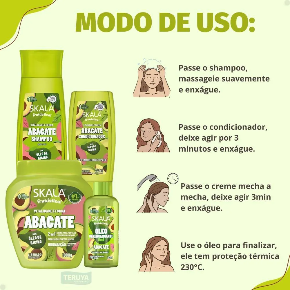 Utilize o Shampoo Skala Frutástica Abacate para uma limpeza suave e eficaz, massageando o couro cabeludo e enxaguando bem.Aplique o Condicionador Skala Frutástica Abacate nos fios úmidos, do comprimento às pontas, e enxágue.Para um tratamento intensivo, utilize o Creme de Tratamento Skala Frutástica Abacate 1000g após o shampoo, deixando agir pelo tempo indicado e enxaguando.Finalize com o Óleo Capilar Skala Frutástica Abacate 90ml, aplicando uma pequena quantidade nas pontas para brilho e proteção.Composição: