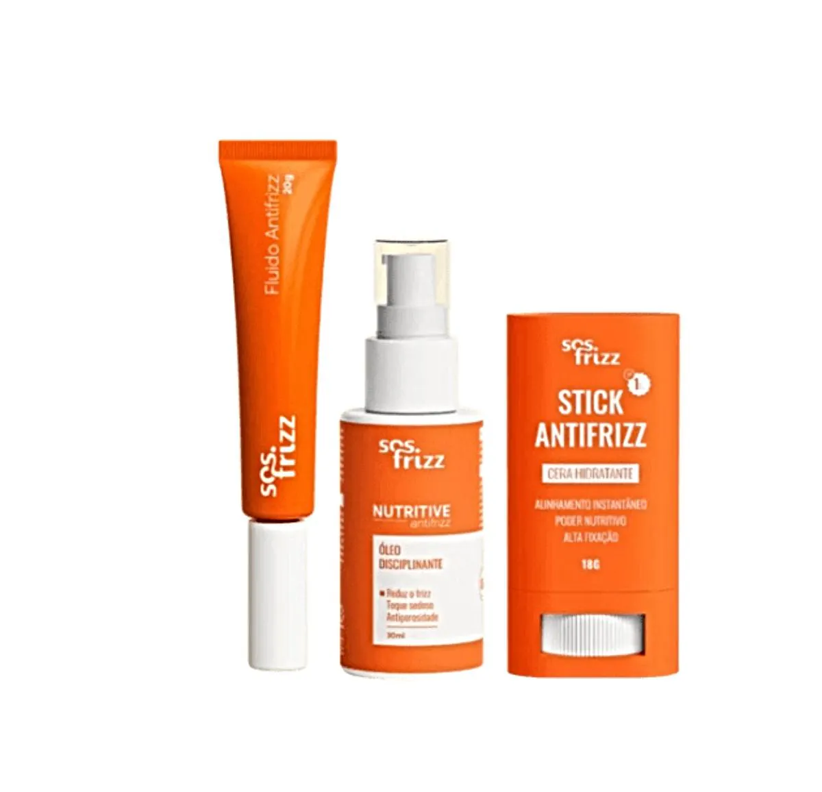 Kit SOS frizz Stick Antifrizz Cera hidratante Alta Fixação 18g+ Nutritive Antifrizz Óleo Disciplinante 30mls+ Fluido Antifrizz- Alinhador de Fios 20g