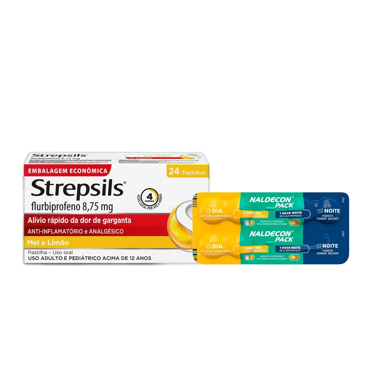 O Kit Strepsils Pastilha para Garganta com Anti-inflamatório e Analgésico Mel e Limão + Naldecon Pack Dia e Noite é composto por Strepsils, uma pastilha que contém flurbiprofeno, um anti-inflamatório não-esteroide (AINE) com propriedades analgésicas, antipiréticas e anti-inflamatórias, e Naldecon, um produto com paracetamol, que age aliviando a dor e a febre, e cloridrato de fenilefrina, que atua como descongestionante nasal. Esse kit é indicado para o alívio sintomático da inflamação da garganta.