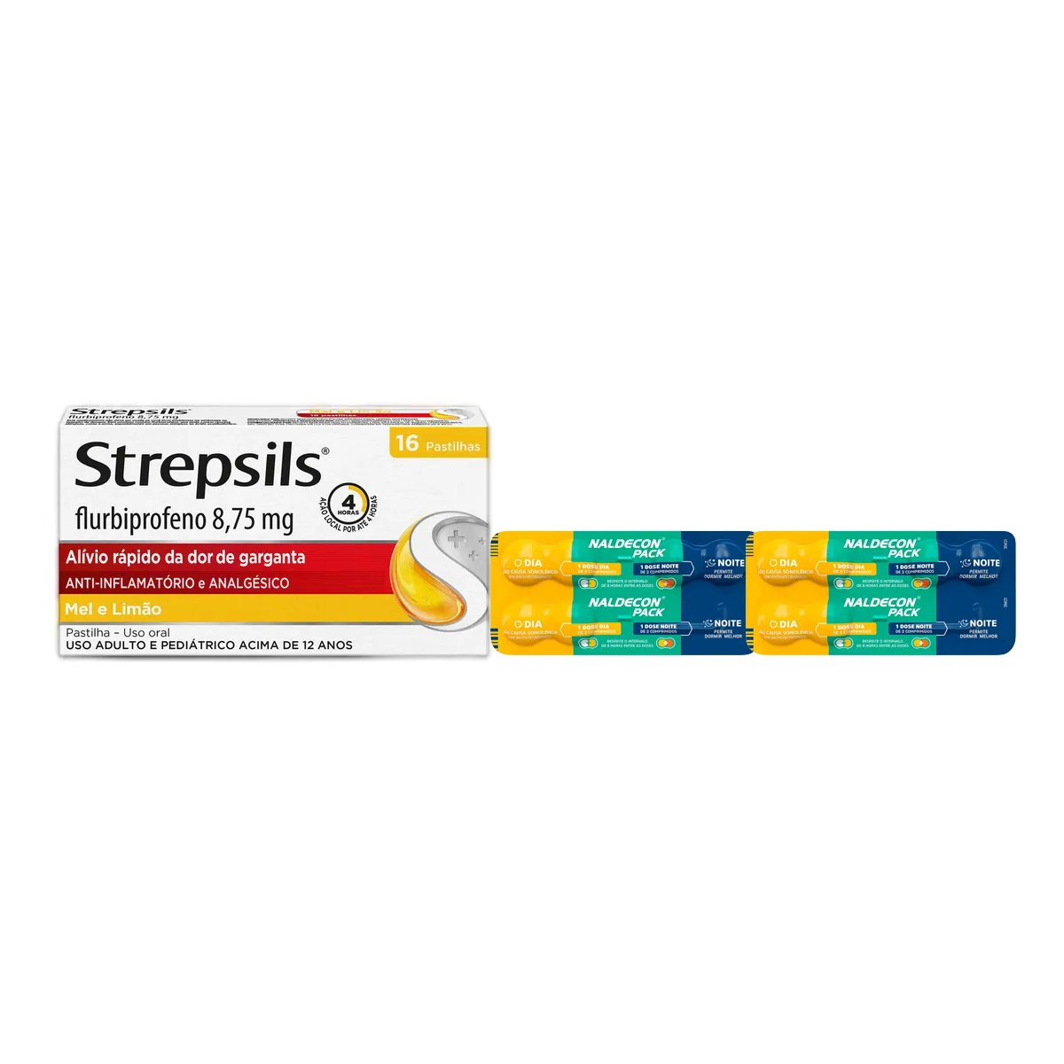 Kit Strepsils Pastilhas para Garganta Mel e Limão 16 Unidades + Naldecon Pack Dia e Noite 6 comprimidos 2 cartelas