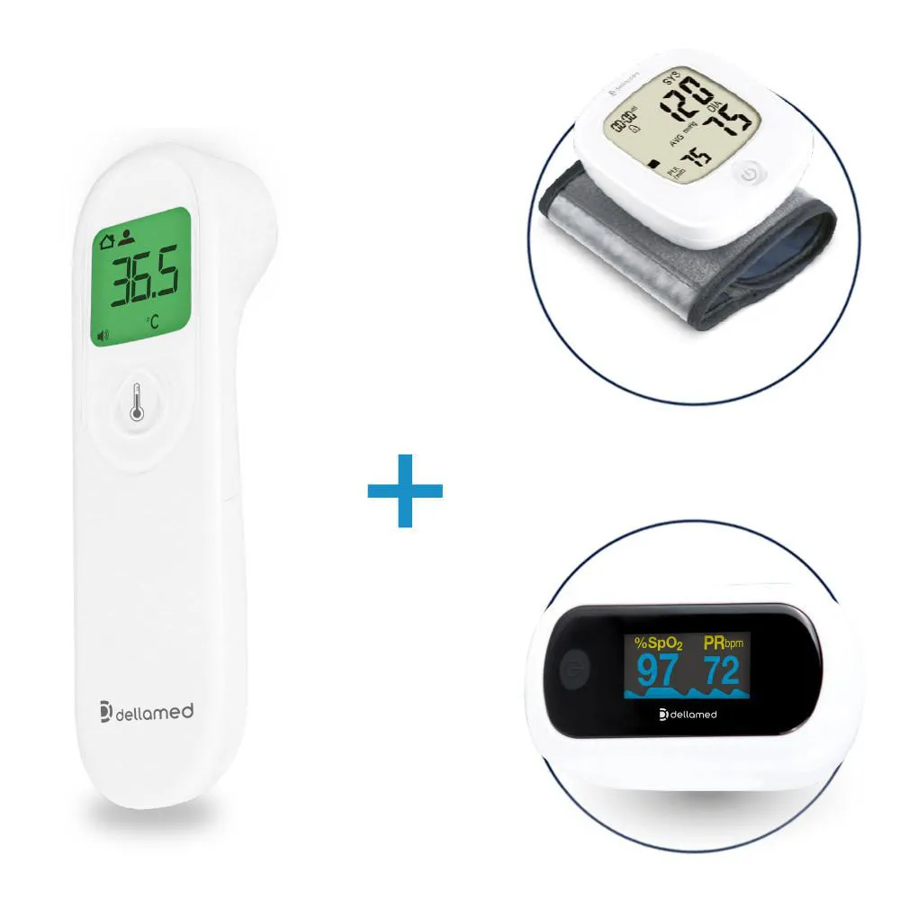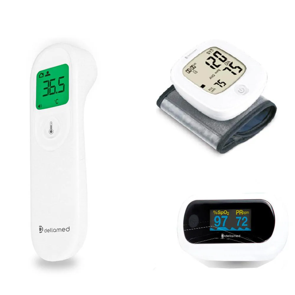 Kit Termômetro Infravermelho + Aparelho de Pressão + Oxímetro com Alarme Dellamed Branco