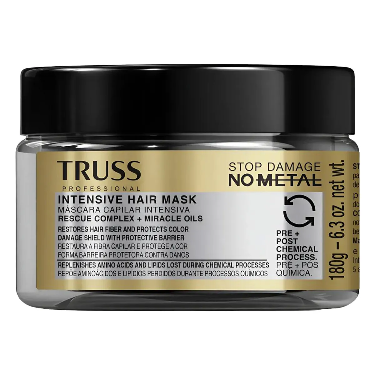 A Truss Stop Damage No Metal Máscara é uma máscara capilar intensiva que reconstrói fios danificados, recompondo aminoácidos e lipídios, criando uma barreira protetora e restaurando a integridade dos cabelos quimicamente tratados.