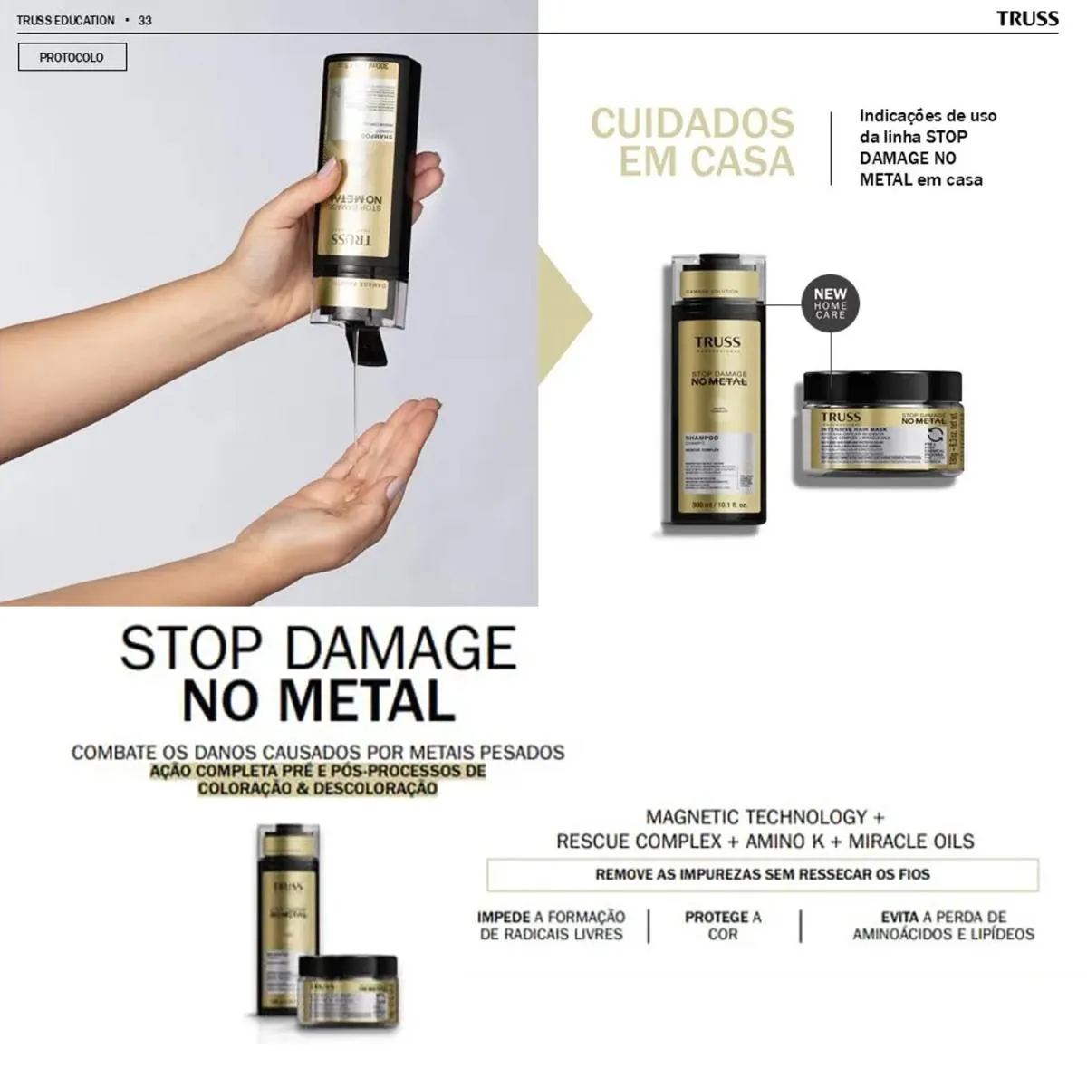 O Truss Stop Damage No Metal Shampoo é um produto específico para limpeza e remoção de metais pesados acumulados nos fios capilares, sendo utilizado antes, durante e após processos químicos como coloração e descoloração, com o objetivo de proteger e restaurar a saúde capilar.
