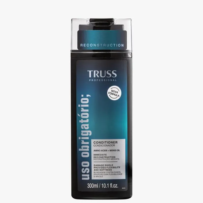 01 condicionador Uso Obrigatório Nano 300ml: Condicionador para cabelos quebradiços, desidratados e com química. TRUSS Uso Obrigatório Reconstruction um tratamento altamente condicionante reconstrutor, com blindagem contra danos, ação antifrizz e antiquebra.