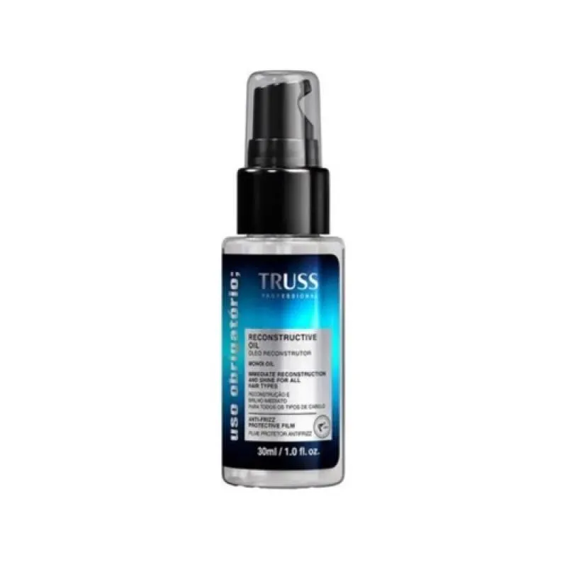 01 Óleo Uso Obrigatório Nano 60ml: Truss Uso Obrigatório Óleo Capilar Reconstrutor é um tratamento capilar inovador desenvolvido especialmente para revitalizar cabelos danificados. Ideal para quem busca uma solução completa no cuidado diário dos fios, este óleo atua tanto externamente quanto internamente nos cabelos. Kit com tratamento reconstrutor para cabelos quebradiços, desidratados e com química. TRUSS Uso Obrigatório Antiafinamento entrega mais corpo e maleabilidade aos fios, para uma manutenção antiafinamento. O Kit TRUSS Uso Obrigatório Antiafinamento traz itens que contribuem com suas fórmulas poderosas e ricas, que penetram na fibra capilar, proporcionando maciez e reconstrução extrema, luminosidade intensa e combatendo o desbotamento, o afinamento e o frizz. Nenhum produto TRUSS é testado em animais, ou seja, este produto possui o selo Cruelty Free. *A nova fórmula consiste na mudança de fragrância de evolução premium, com notas frutais leves e sofisticada, assinada por uma das maiores Casas de Fragrâncias do mundo, a Givaudan. **O produto herói mantém a fórmula de alta performance, com destaque para sua potência de 87% menos quebra para todos os tipos de cabelos danificados. Sugestão de uso Shampoo: Aplique nos cabelos molhados, massageando suavemente o couro cabeludo até formar espuma. Deixe agir por 2 minutos e depois enxágue. Reaplique se necessário.