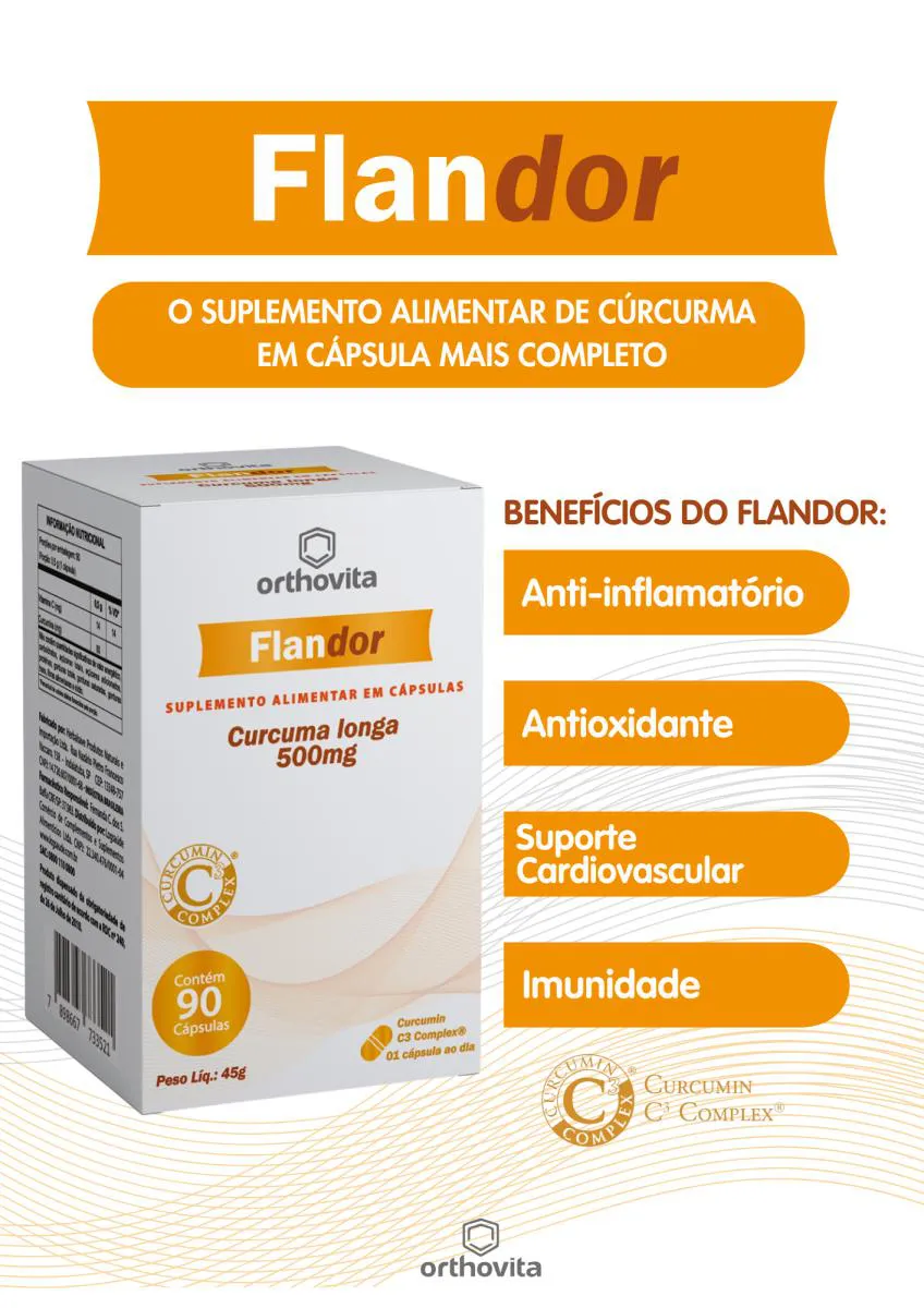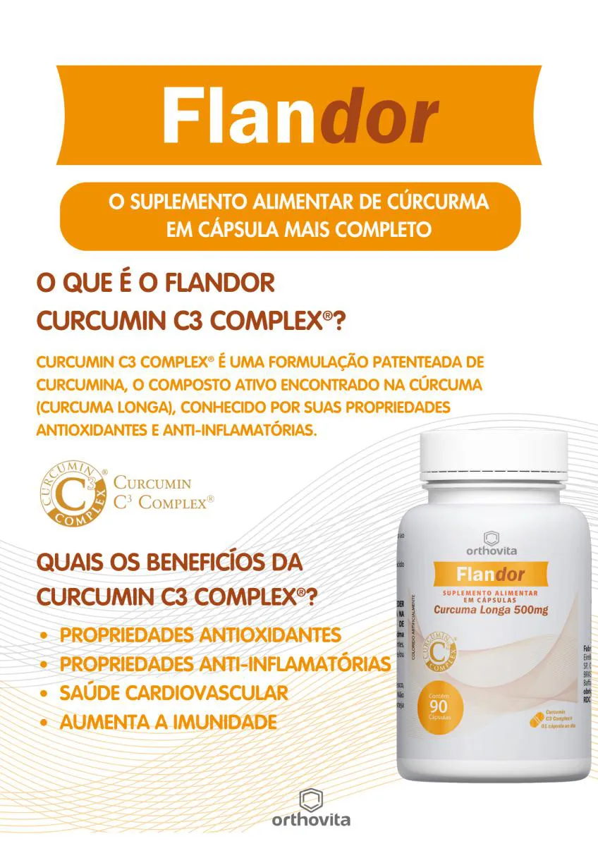 O que é o Flandor Curcumin C3 Complex®?Curcumin C3 Complex® é uma formulação patenteada de curcumina, o composto ativo encontrado na cúrcuma (Curcuma longa), conhecido por suas propriedades antioxidantes e anti-inflamatórias.