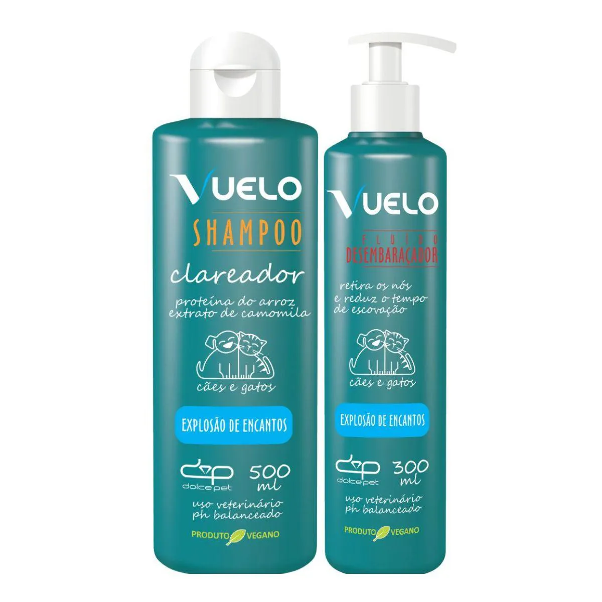 Kit Vuelo shampoo Clareador + Fluído Desembaraçador Explosão de Encantos para Cães e Gatos Shampoo Clareador Vuelo: Especialmente formulado para pets com pelagens claras e douradas, este shampoo realça os tons e traz brilho intenso. Sua fórmula com Extrato de Camomila clareia naturalmente e elimina manchas amareladas, enquanto o Complexo de Flores de Violeta promove uma matização gradual, deixando a pelagem radiante e livre de resíduos indesejados. Ideal para cães e gatos a partir de 6 meses. Fluído Desembaraçador Vuelo: Facilita o desembaraço, deixando os pelos mais fáceis de pentear, macios e com brilho natural. Sua hidratação profunda protege contra frizz e agressões externas, promovendo um pelo saudável e bonito. Perfeito para uso diário ou após o banho. Benefícios: