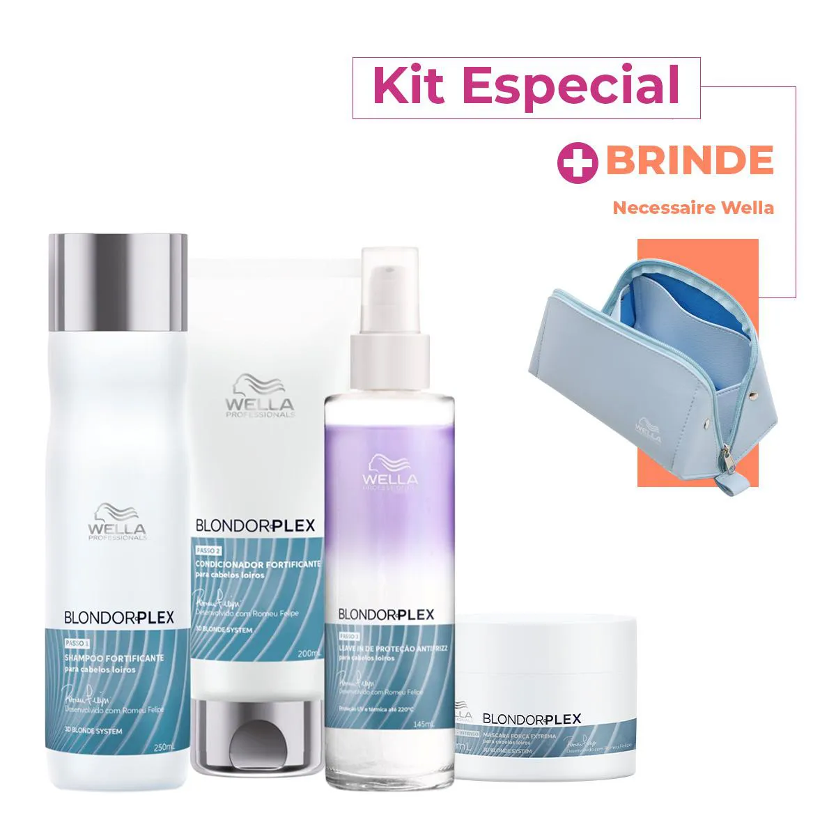 Wella Professionals BlondorPlex - Nutrição, Reparação e Brilho para Cabelos Loiros Este Kit Contém Wella Professionals BlondorPlex - shampoo 250ml: proporciona limpeza suave que fortalece e repara, garantido brilho intenso e fios revitalizados. Wella Professionals BlondorPlex - condicionador 200ml: nutrição intensa que repara profundamente, reduz o frizz, restaura a maciez e garante brilho radiante. Wella Professionals BlondorPlex - Máscara Capilar 150ml: com ação antiquebra, hidratação profunda, reconstrução da fibra e proteção contra metais e radicais livres. Wella Professionals BlondorPlex Bifásico Antifrizz - Leave-in 145ml: com proteção térmica até 220°C, escudo anti-frizz e filtro UV. Garante fios loiros alinhados, macios e com brilho, mesmo ao utilizar ferramentas de calor. Brinde Wella Professionals Necessaire Azul: prática, sofisticada e espaçosa, mantém seus produtos organizados e é ideal para acompanhar sua rotina de beleza no dia a dia ou em viagens.