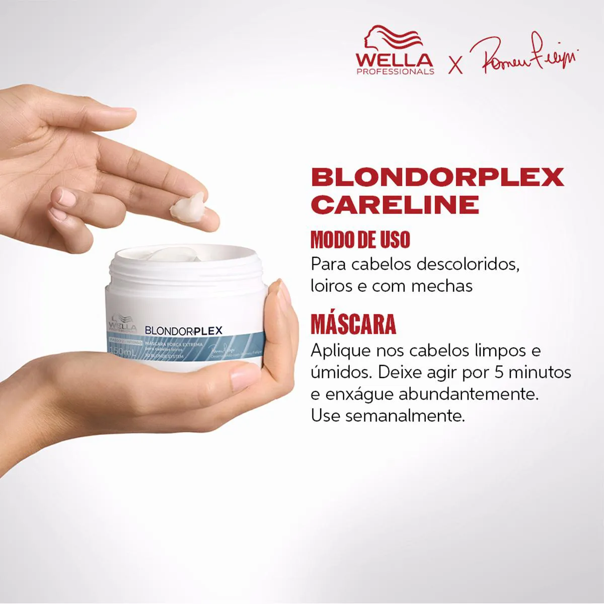 Wella Professionals BlondorPlex - Tratamento Profundo com 3D Blonde System Este Kit Contém Wella Professionals BlondorPlex - shampoo 250ml: remove impurezas sem agredir, enquanto fortalece, repara e devolve o brilho aos fios loiros fragilizados. Wella Professionals BlondorPlex - condicionador 200ml: repara profundamente, reduz o frizz e devolve a maciez. Fórmula com ativos potentes que restauram a fibra capilar, deixando os fios saudáveis, alinhados e luminosos. Wella Professionals BlondorPlex - Máscara Capilar 150ml: trata profundamente, fortalece contra a quebra e hidrata intensamente. Com 3D Blonde System, protege os fios dos metais e radicais livres, promovendo brilho, saúde e sedosidade duradoura.