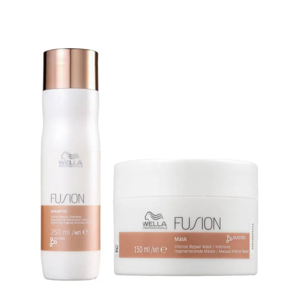 Kit Wella Professionals Fusion shampoo e Máscara (2 Produtos)   Este Kit Contém   Wella Professionals Fusion - Shampoo 250ml: oferece uma limpeza muito delicada aos fios, ao mesmo tempo em que ajuda a reparar a estrutura. Wella Professionals Fusion - Máscara Reconstrutora 150ml: fortalece a fibra intensamente, evita quebras e possui agentes condicionantes que garantem o toque macio e luxuoso.