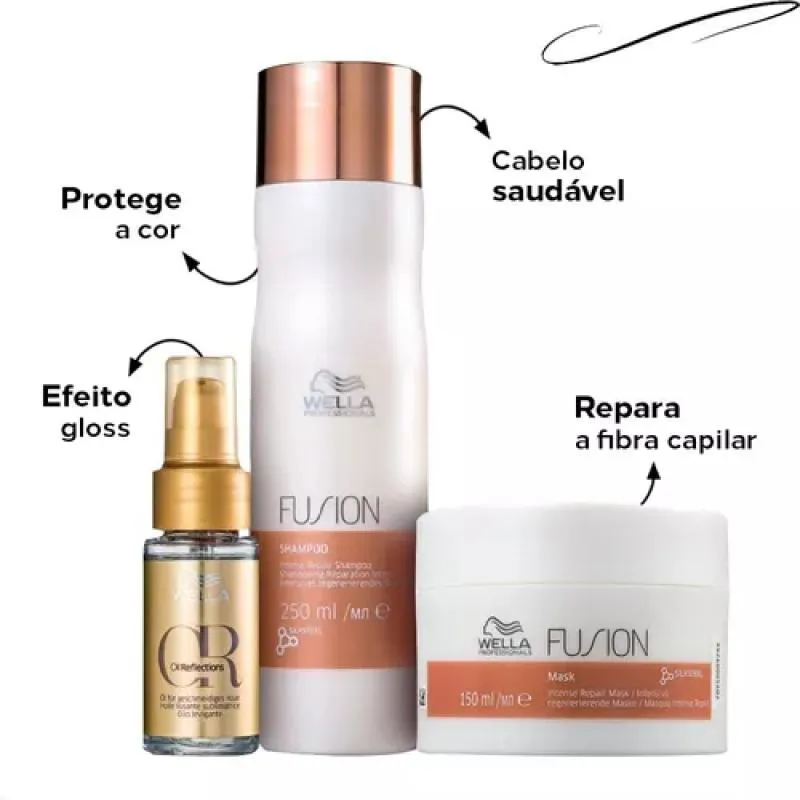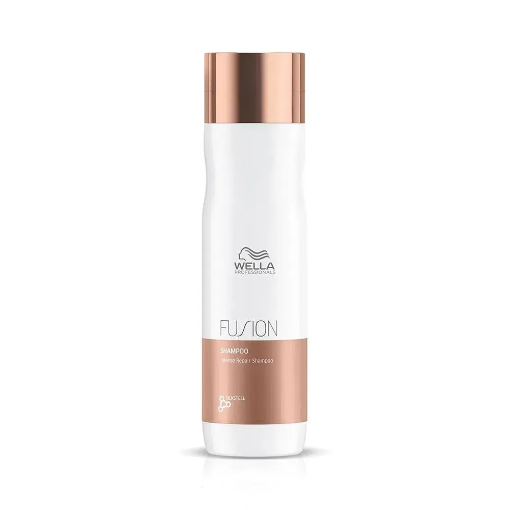 - Wella Professionals Fusion - shampoo 250ml: limpa e auxilia na reparação dos danos.