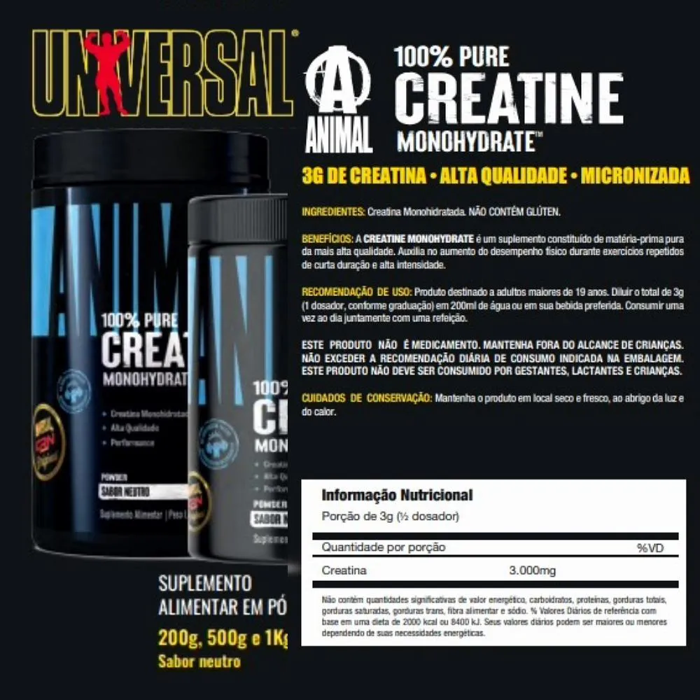 • Creatina Animal 500g (Universal): aumento de força, potência e desempenho físico