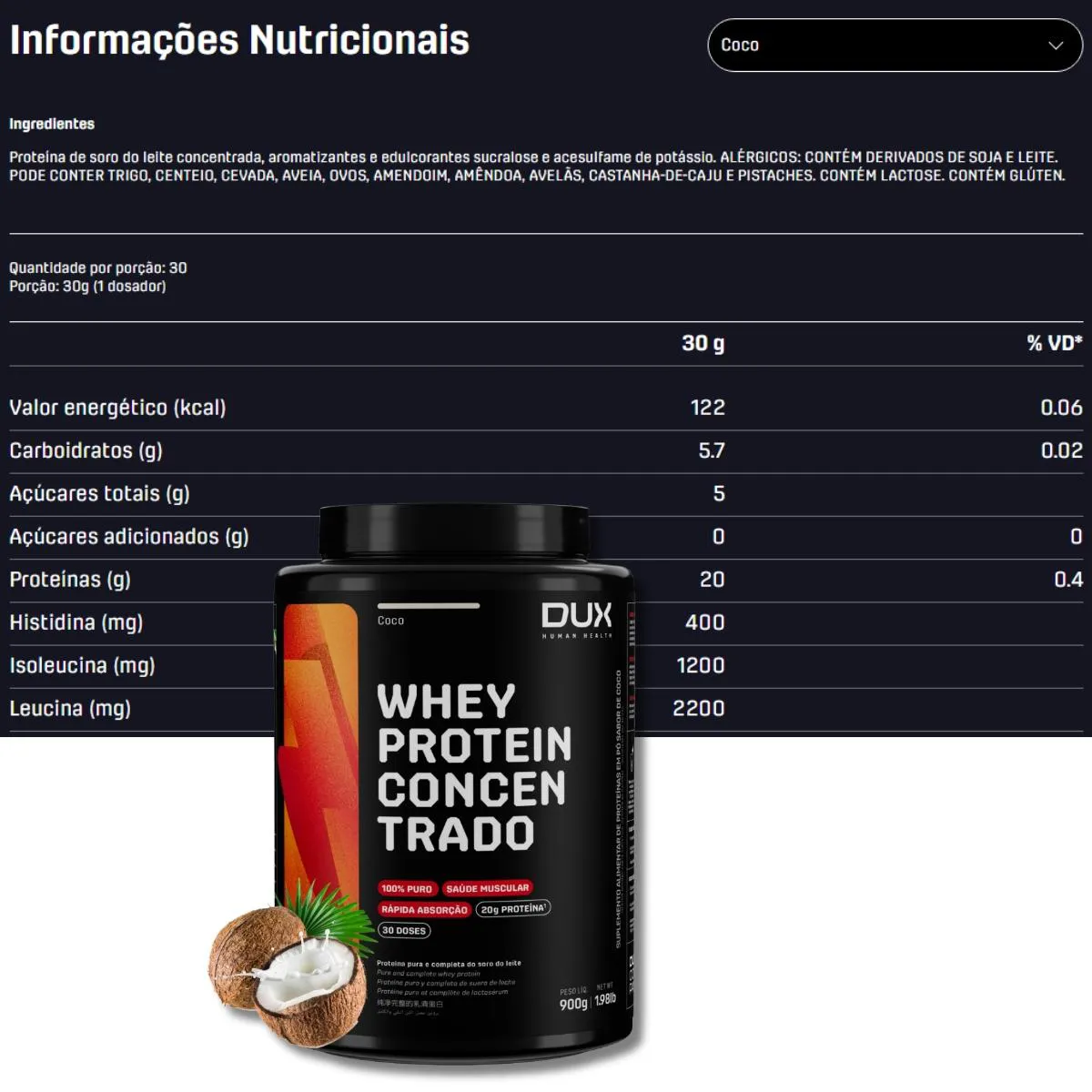 - Whey Concentrado de alto rendimento e custo-benefício com sabor coco