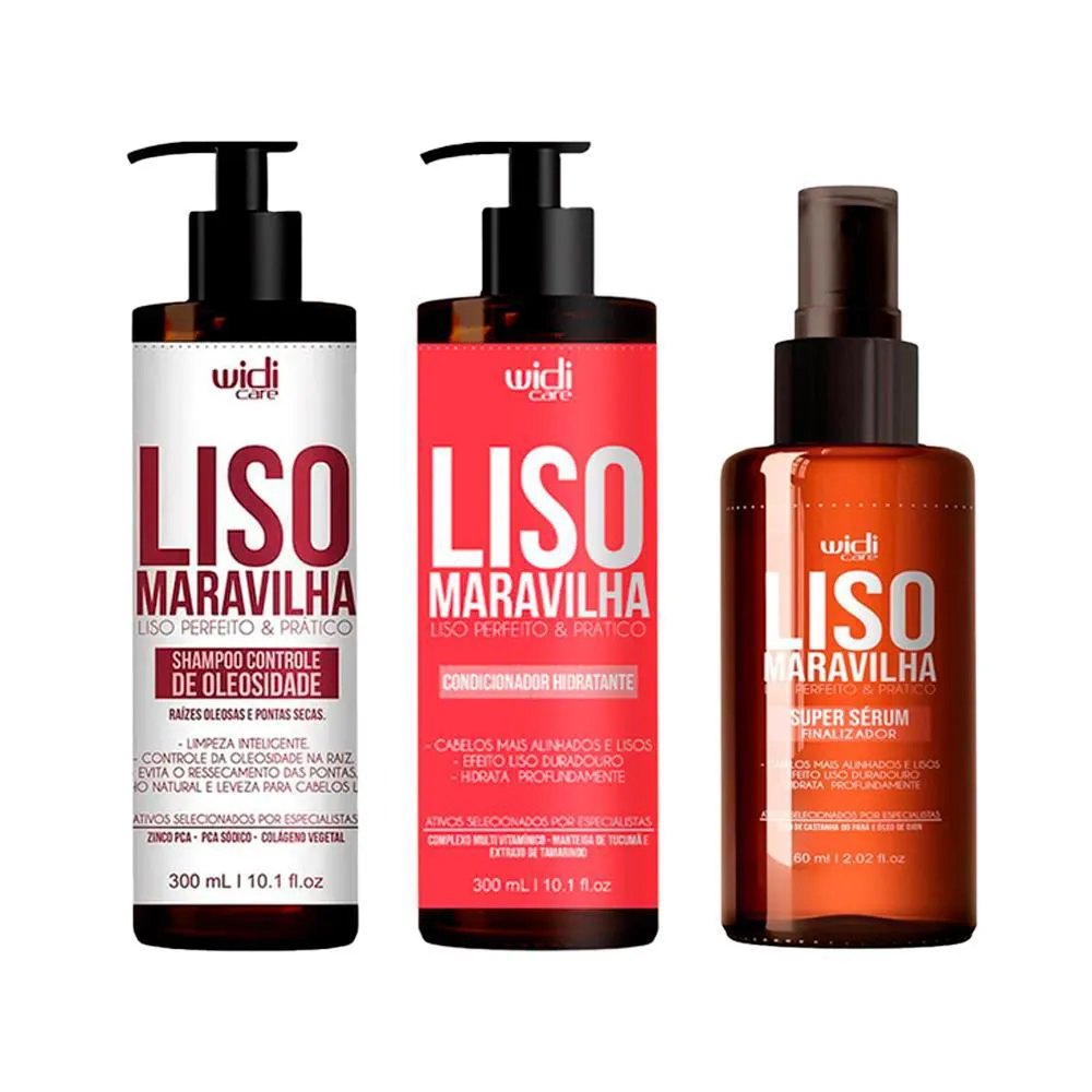 1- Shampoo Widi Care Controle de Oleosidade Liso Maravilha 300ml1- Condicionador Widi Care Hidratante Liso Maravilha 300ml1- Serum Widi Care Liso Maravilha 60ml.