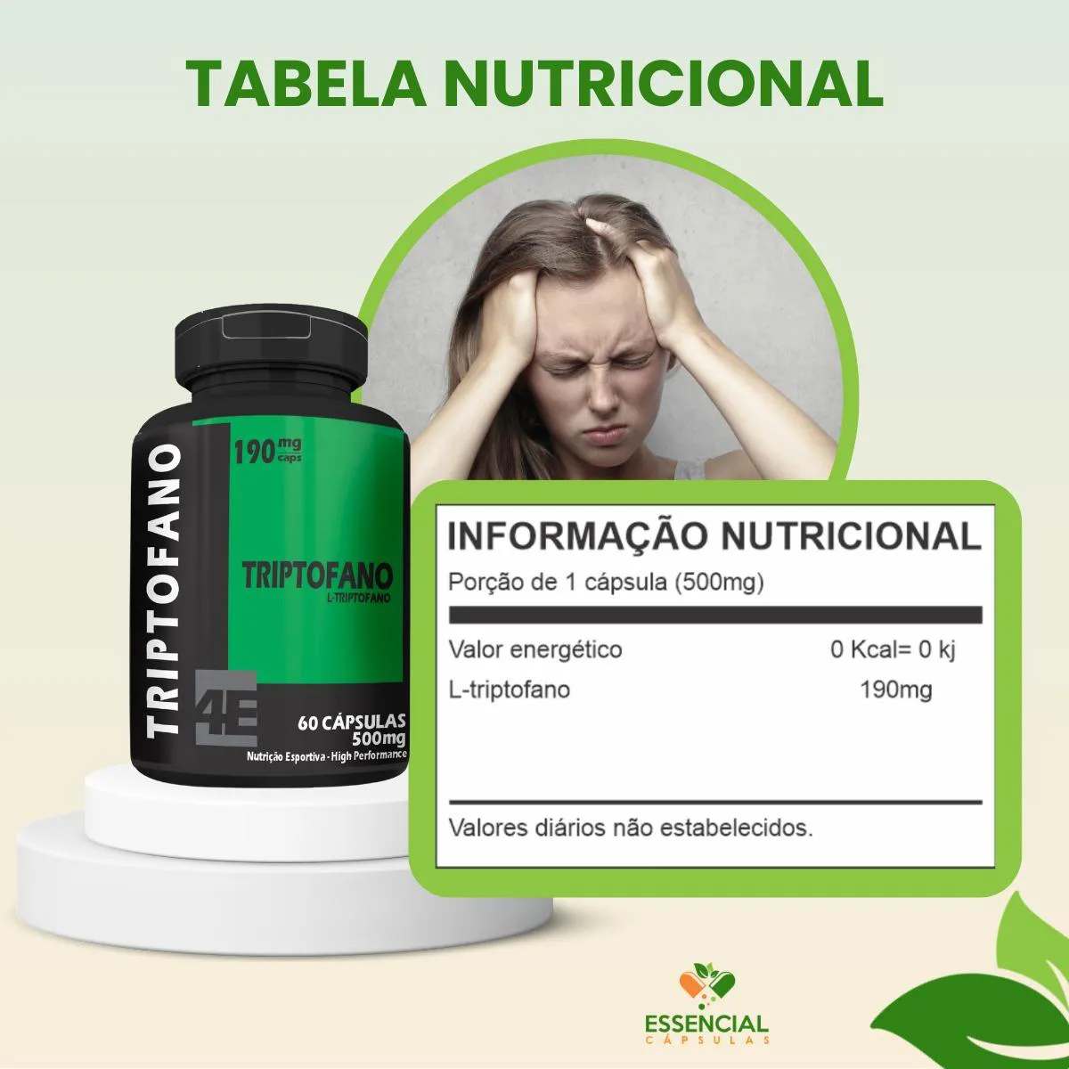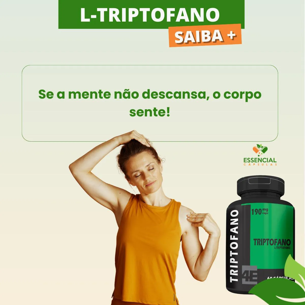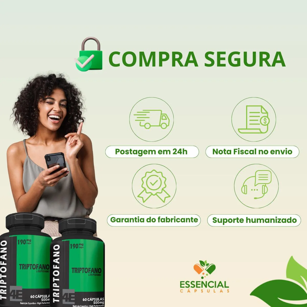 BEM VINDO(A) À ESSENCIAL CÁPSULAS Aqui, acreditamos que cuidar da saúde pode (e deve) ser algo natural, leve e diário. PRODUTO: - L-Triptofano MARCA: - 4Elementos BENEFÍCIOS: ● Escolha certa em fases de maior tensão ● Presença frequente em rotinas noturnas SUGESTÃO DE CONSUMO (PELO FABRICANTE): - 1 cápsula ao dia - Ingerir com 200ml de água IMPORTANTE SABER: - Este produto é um suplemento alimentar natural. - Não é medicamento e não substitui uma alimentação equilibrada nem o acompanhamento de um profissional da saúde. - Como um produto natural, seus benefícios podem ser vistos a partir de alguns dias do uso. - Os suplementos são destinados a pessoas saudáveis. Sua finalidade é fornecer nutrientes, substâncias bioativas, enzimas ou probióticos em complemento à alimentação. COMPOSIÇÃO: - L-TRIPTOFANO. NÃO CONTÉM GLÚTEN CONTRAINDICAÇÃO: - O uso não é recomendado para gestantes, lactantes e crianças. - Em caso de uso contínuo de medicamentos ou condições específicas de saúde, busque a orientação de um profissional da saúde. QUALIDADE: - Sabemos que o mercado de suplementos é competitivo, com opções para todos os públicos e faixas de preço. Na nossa loja, priorizamos a qualidade em cada detalhe. Por isso, escolhemos trabalhar apenas com fábricas que utilizam matérias-primas de excelência e seguem rigorosos padrões de produção. ENVIAMOS RAPIDINHO: - Seu pedido é preparado com todo cuidado e postado em até 24 horas úteis após a confirmação da compra. (Na maioria das vezes, enviamos bem antes disso)! FALE CONOSCO: Tem dúvidas ou quer conversar sobre o produto? Nosso atendimento é humanizado e está sempre pronto para te ouvir com muita atenção!