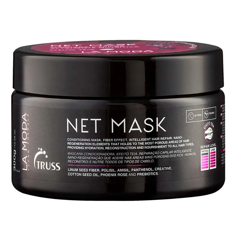 NET MASK Indicada para todos os tipos de cabelos, essa máscara teia com exclusivo efeito para nanorreposição da massa proteica e a nanorregeneração dos fios danificados vai envolver você! A Net Mask LA MODA VEGAN restaura a elasticidade, força e aparência natural do cabelo, sela as cutículas e prolonga a hidratação, além de intensificar o brilho dos fios. Em cabelos étnicos promove a definição dos cachos e, nos demais tipos de cabelos, fios disciplinados, sedosos e brilhantes. Promove redução de volume e confere maciez.