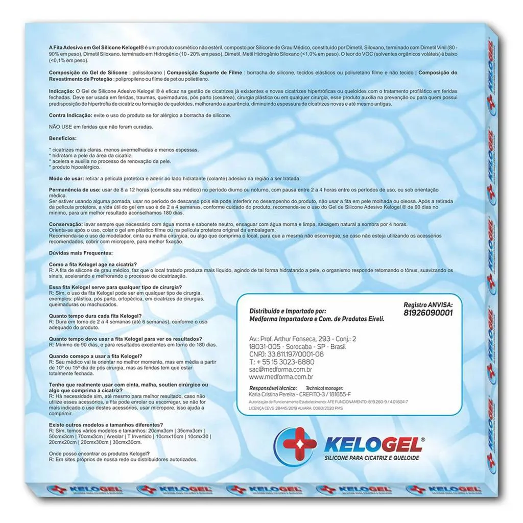 Indicação: O Gel de Silicone Adesivo Kelogel® é eficaz no tratamento de cicatrizes, cicatrizes hipertróficas e queloides em feridas fechadas. É indicado para uso em feridas, traumas, queimaduras, pós-parto (cesárea), cirurgias plásticas ou outras, auxiliando na prevenção de hipertrofia de cicatriz ou formação de queloides, melhorando a aparência e diminuindo a espessura de cicatrizes novas e antigas. Benefícios: Cicatrizes mais claras, menos avermelhadas e menos espessas. Contraindicação: Evite o uso do produto se for alérgico a borracha de silicone. Não use em feridas não cicatrizadas. Modo de usar: Higienize as mãos, certificando-se de que estejam livres de produtos oleosos. Limpe e sanitize a pele onde será aplicado, não use pomada, creme ou algo oleoso. Seque, retire a película protetora e aplique o lado colante na região. Use de 8 a 12 horas diurnas ou noturnas, com pausas de 2 a 4 horas entre os períodos de uso ou conforme orientação médica. Se estiver usando pomada, aplique durante o período de descanso, pois pode interferir no desempenho do produto. Após a retirada da película protetora, a vida útil do gel é de 2 a 4 semanas, dependendo dos cuidados. Recomenda-se o uso do Gel por no mínimo 90 dias, aconselhando-se 180 dias para melhores resultados. Conservação: Lave sempre que necessário com água morna e sabonete neutro, enxague com água morna, deixe secar naturalmente à sombra por 4 horas. Use modelador, cinta ou malha cirúrgica para comprimir o local e evitar que escorregue, cobrindo com micropore para melhor fixação. REGISTRO ANVISA/ MS nº 81926090001