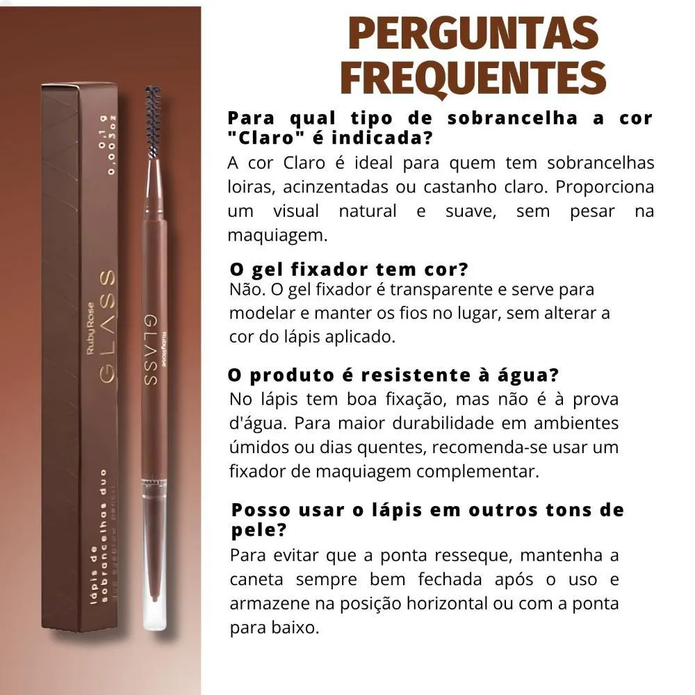 - Lápis 2 em 1 com ponta macia e gel fixador.