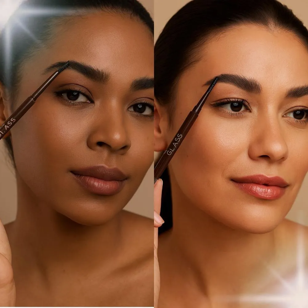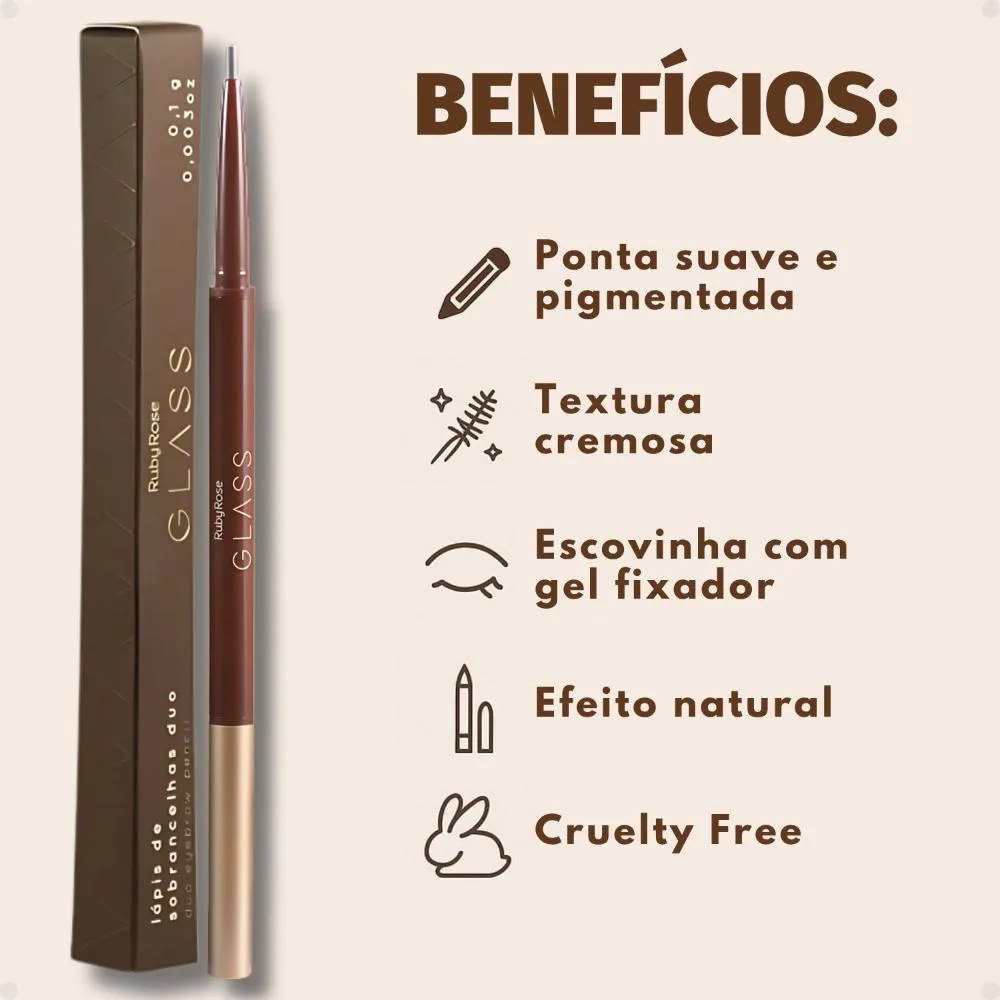 Lápis de Sobrancelhas Duo Ruby Rose Glass Hb-526-3O Lápis de Sobrancelhas Duo Glass Ruby Rose é a escolha ideal para quem busca sobrancelhas bem definidas, naturais e com acabamento profissional. Com a cor Escuro, é perfeito para tonalidades de sobrancelhas castanho escuro a preto, proporcionando um visual harmônico e elegante. Este lápis 2 em 1 combina praticidade e eficiência: de um lado, uma ponta macia e pigmentada para preencher e definir; do outro, uma escovinha com gel fixador transparente que ajuda a alinhar e manter os fios no lugar durante todo o dia. A textura cremosa do lápis desliza facilmente, permitindo traços finos ou mais preenchidos, conforme sua preferência. Além de sua performance eficiente, o produto também é cruelty-free, ou seja, não é testado em animais — um cuidado a mais com você e com o meio ambiente..Benefícios