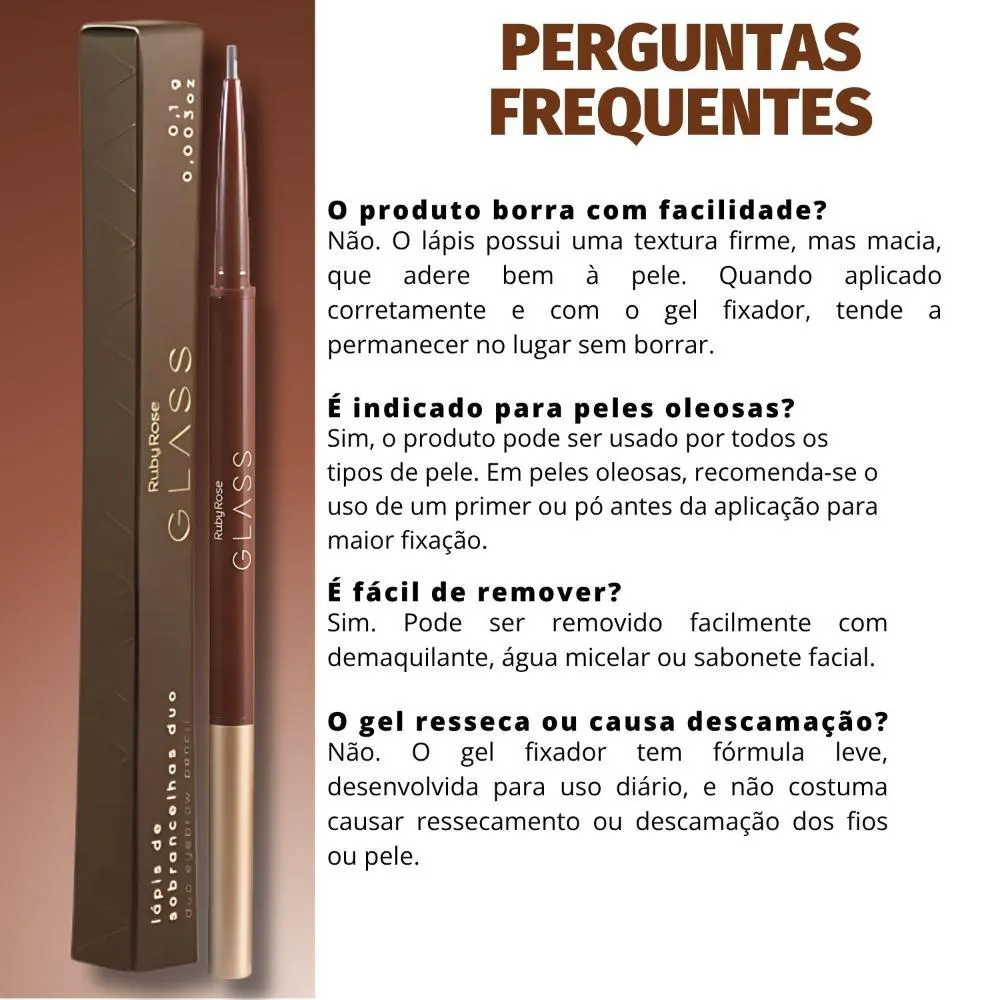 - Lápis 2 em 1 com ponta macia e gel fixador.