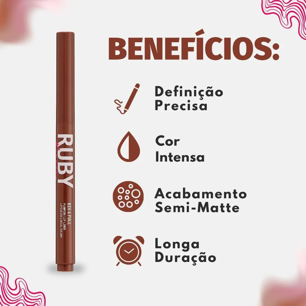 Proporciona volume instantâneo aos lábios, realçando sua forma natural.Oferece definição precisa para um contorno labial impecável.Cor intensa e duradoura com acabamento semi-matte.Prepara os lábios para a aplicação de batom ou gloss, aumentando a fixação e o efeito de volume.Diferenciais do Produto