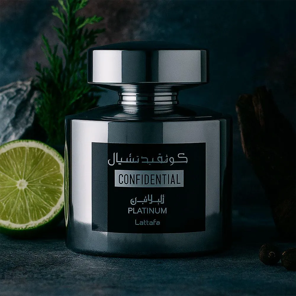 Lattafa Confidential Platinum Eau de Parfum é uma fragrância amadeirada aromática fresca e sofisticada, ideal para homens modernos e confiantes que desejam uma presença revigorante e duradoura. Lançada em 2022 como uma homenagem à elegância masculina, esta essência combina o frescor cítrico de bergamota e cítricos com notas verdes de cipreste e pimenta preta, evoluindo para um coração marinho e olibano, e finalizando em uma base profunda de ambroxan, ládano, musgo e musk. Perfeita para quem busca um perfume que une vitalidade aquática e sofisticação amadeirada, Confidential Platinum transforma o dia a dia em uma declaração de poder e frescor, criando uma conexão emocional de confiança e distinção inabalável.