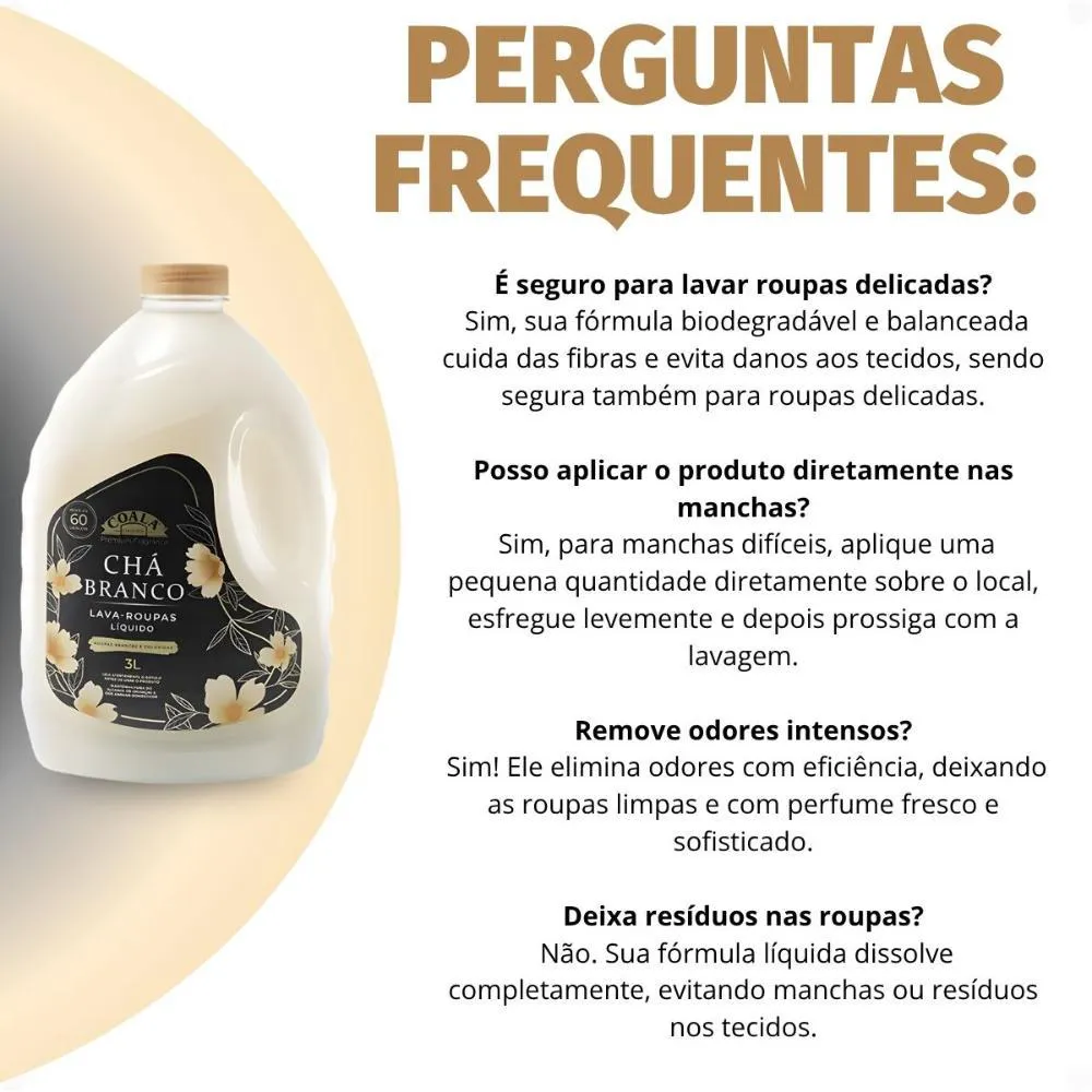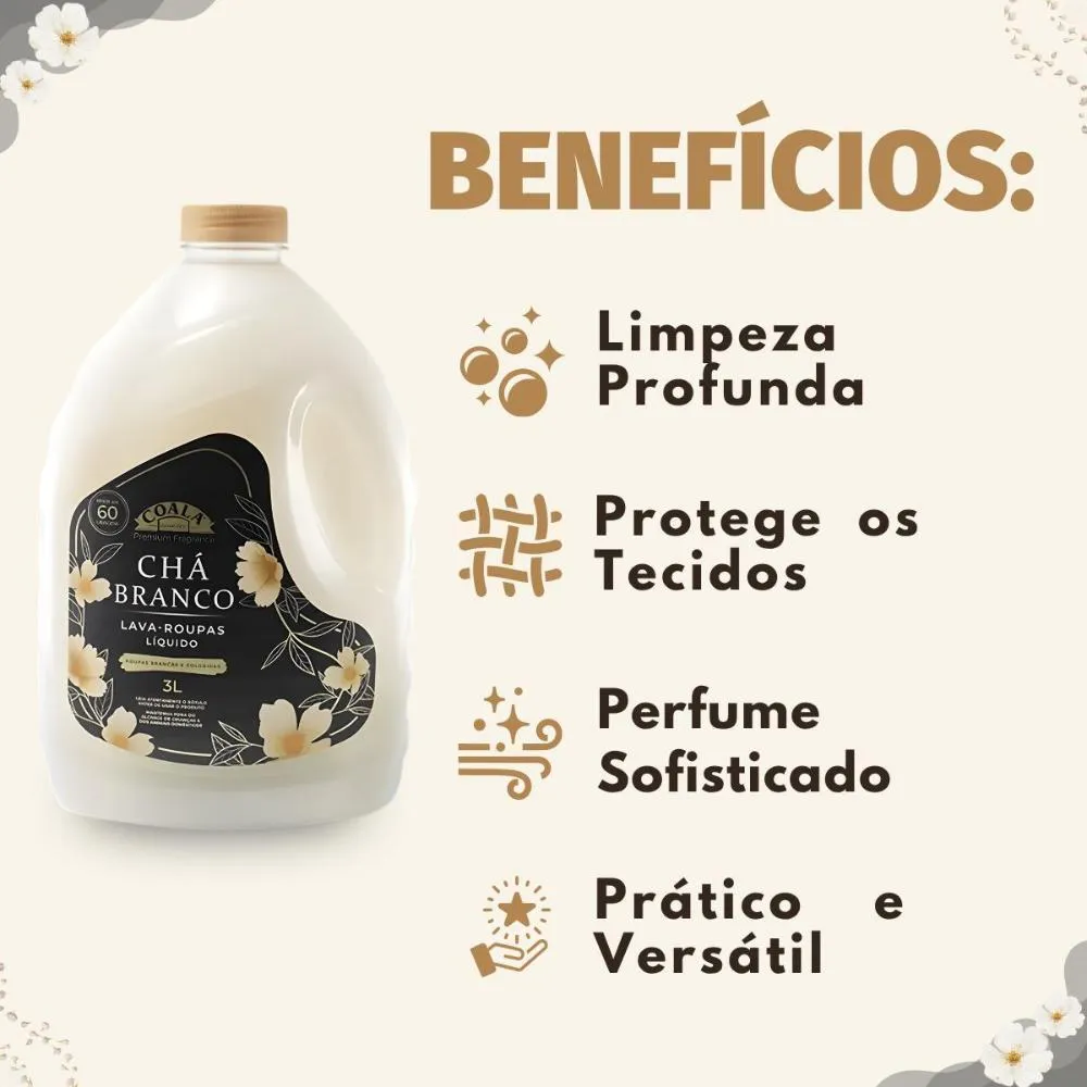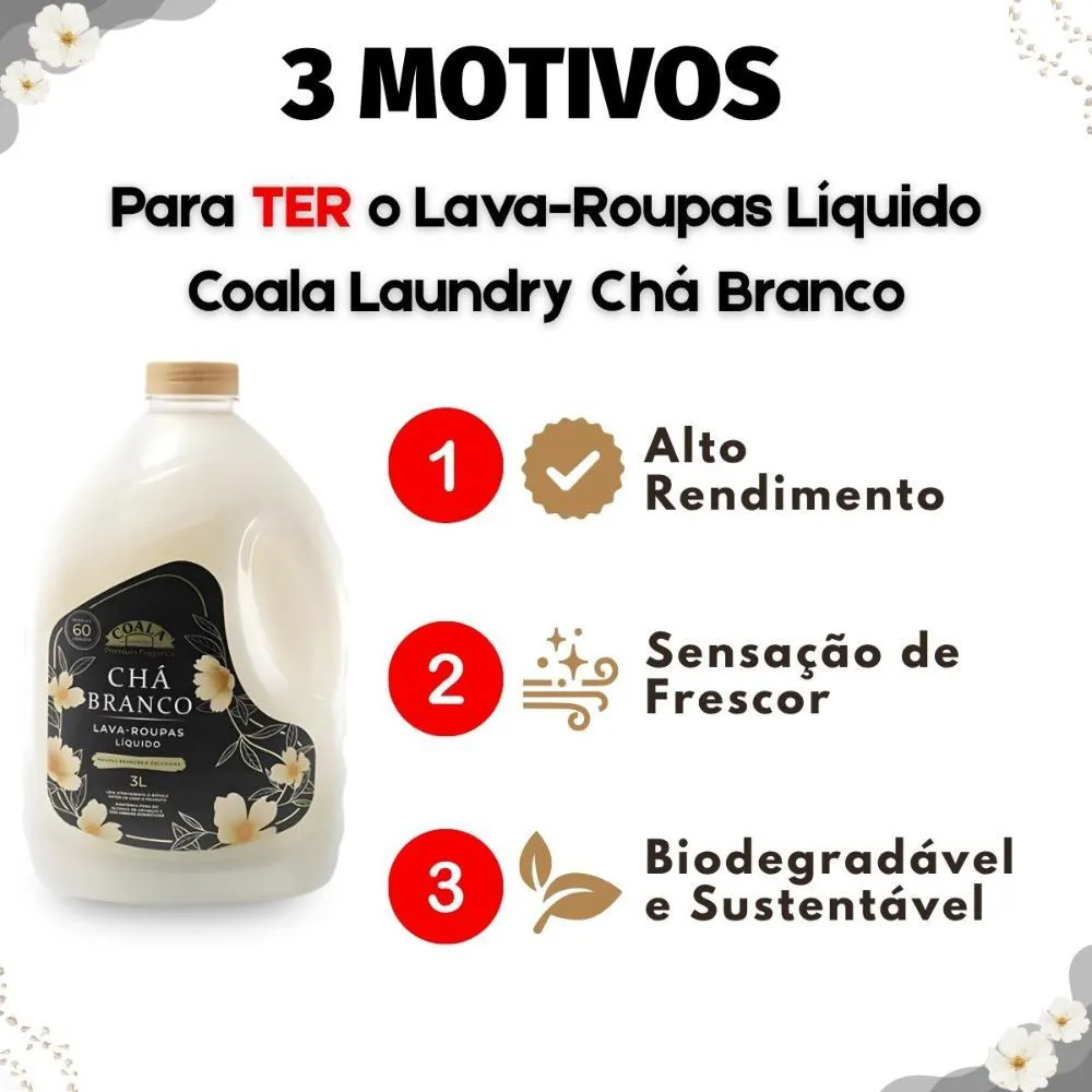 O Lava-Roupas Líquido Coala Laundry Chá Branco Roupas Brancas e Coloridas 3L da Coala é a solução ideal para quem busca uma limpeza profunda e um aroma sofisticado para suas peças. Desenvolvido para valorizar alto desempenho e uma fragrância refinada, este lava-roupas líquido garante que suas roupas, tanto brancas quanto coloridas, fiquem impecáveis e com um cheirinho fresco e elegante de Chá Branco. Sua fórmula exclusiva não só limpa profundamente, mas também é composta por ativos biodegradáveis e de fontes renováveis, assegurando eficiência, segurança e um toque perfumado duradouro. Perfeito para o dia a dia, este produto oferece até 60 lavagens, combinando cuidado e economia para suas roupas. Ideal para quem busca praticidade e um toque de sofisticação no cuidado com as roupas, o Lava-Roupas Coala Laundry Chá Branco transforma a rotina de lavanderia em um momento de prazer.Benefícios Principais