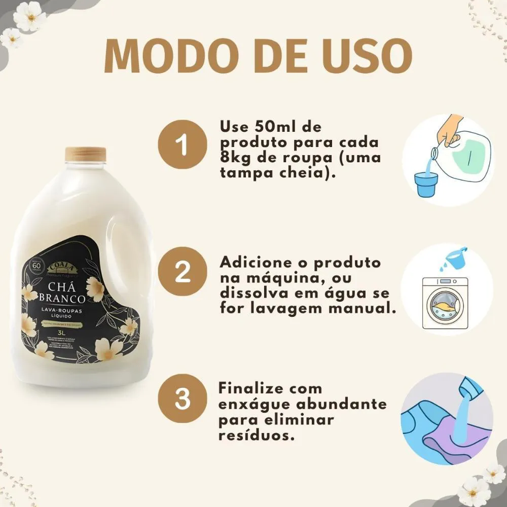 O Lava-Roupas Líquido Coala Laundry Chá Branco é perfeito para o uso diário, garantindo que suas roupas estejam sempre limpas, cheirosas e bem cuidadas. Ideal para famílias que buscam praticidade e eficiência, e para quem valoriza uma fragrância sofisticada em suas peças. Use-o para lavar desde as roupas do dia a dia até as peças mais delicadas, garantindo sempre um resultado impecável. Perfeito para quem busca um toque de frescor e elegância em cada lavagem.Modo de Uso/Aplicação