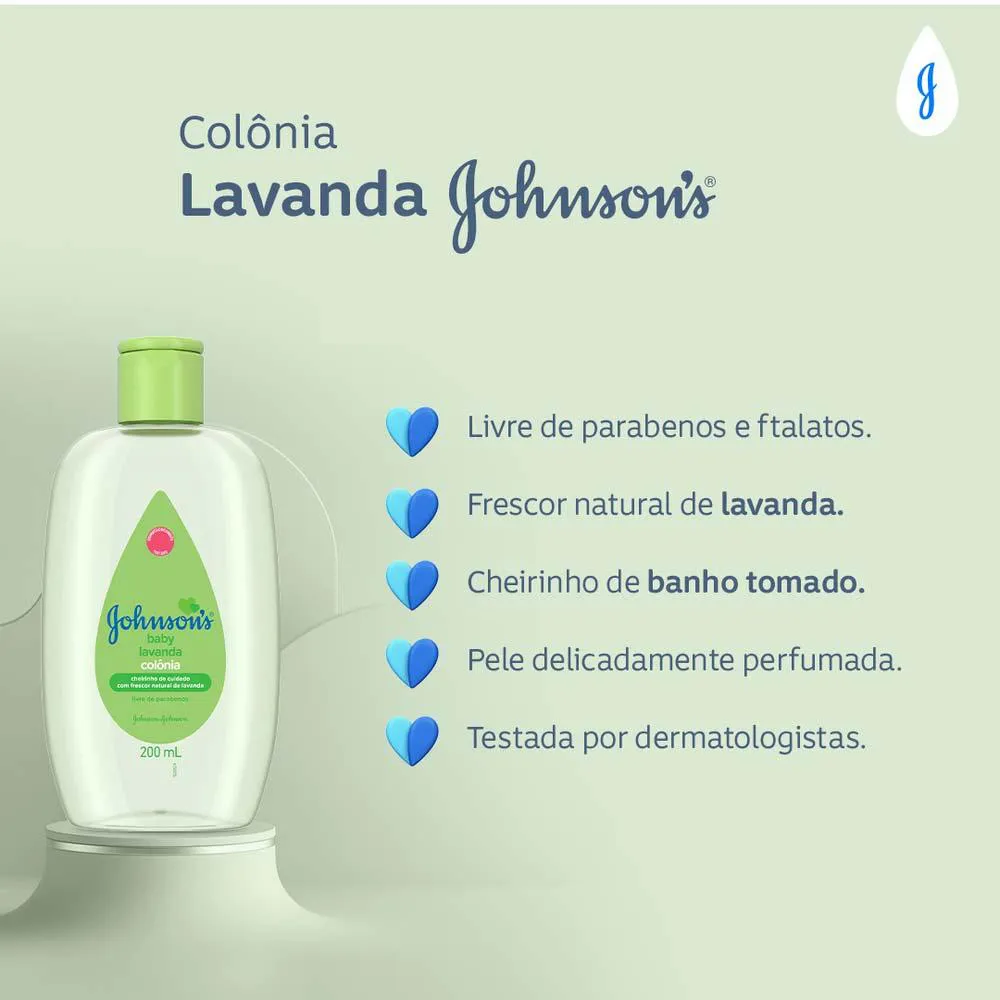 A colônia Johnson's Baby Lavanda traz um frescor natural e agradável à pele do bebê, deixando um cheirinho de banho tomado. É dermatologicamente testado e é livre de parabenos e ftalatos; a aplicação do produto no bebê deixa sua pele delicadamente perfumada.
